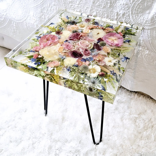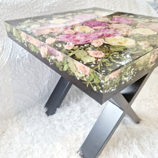 Square 45cm side table. Floral resin table