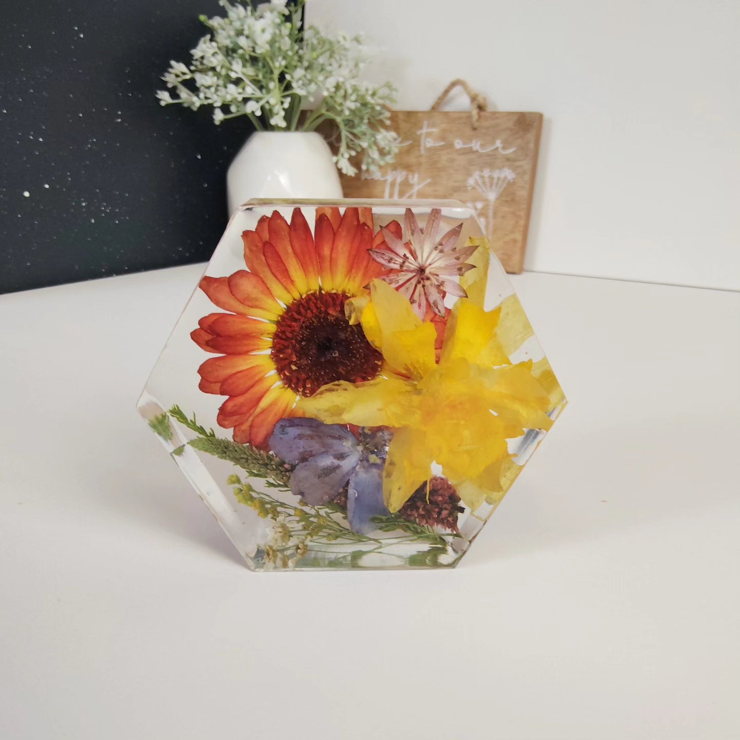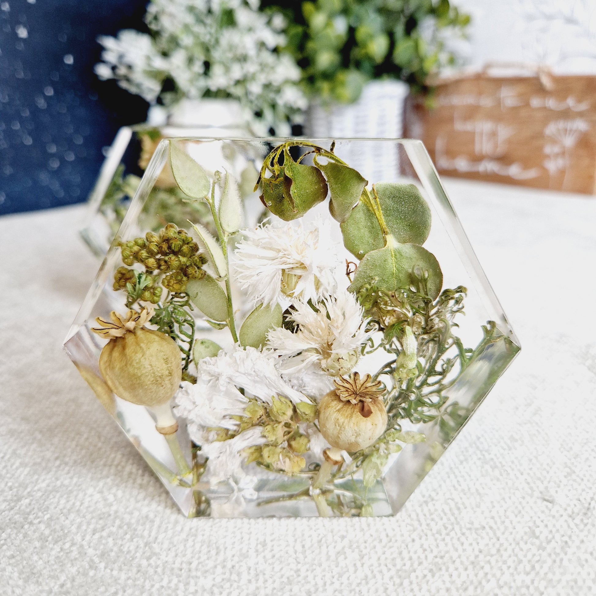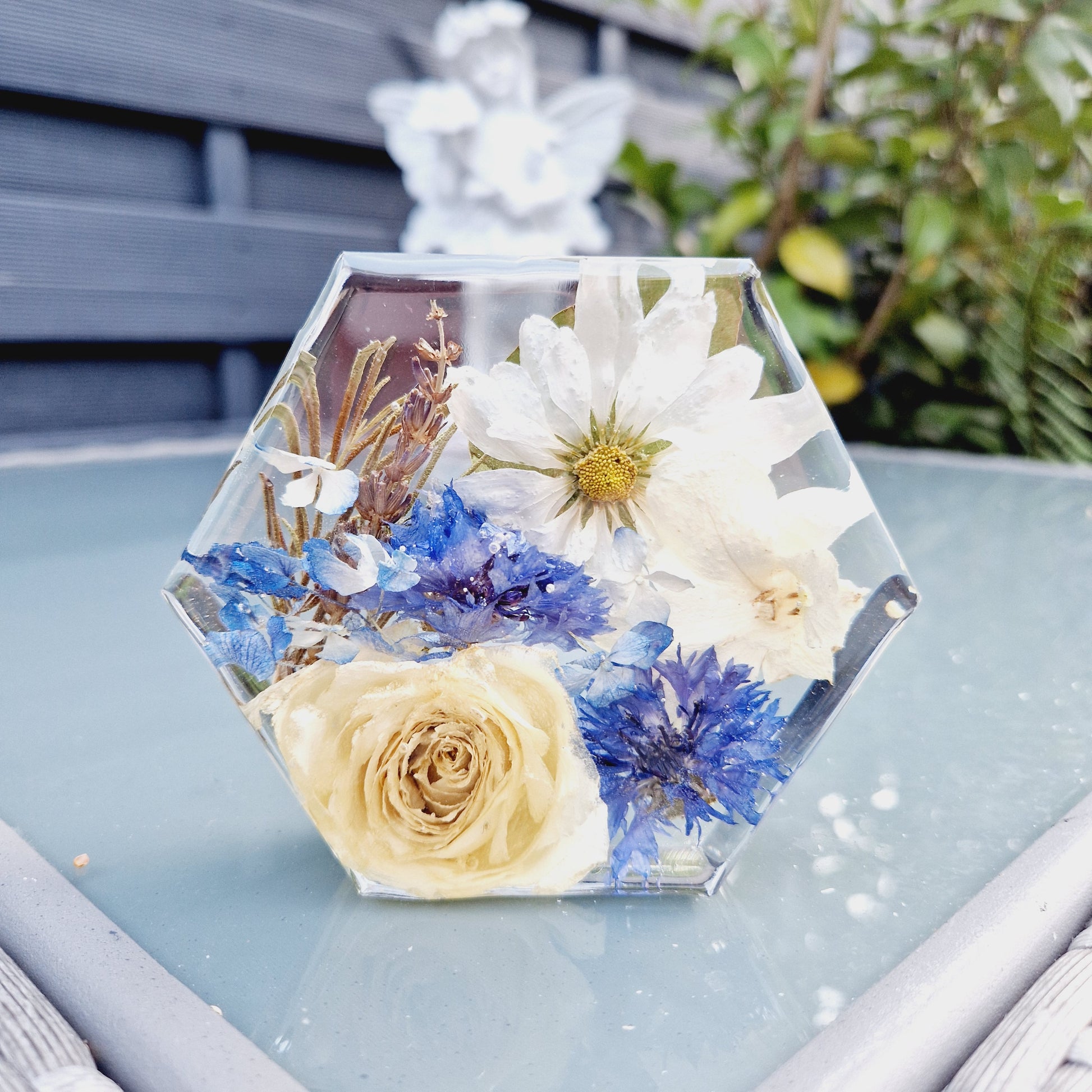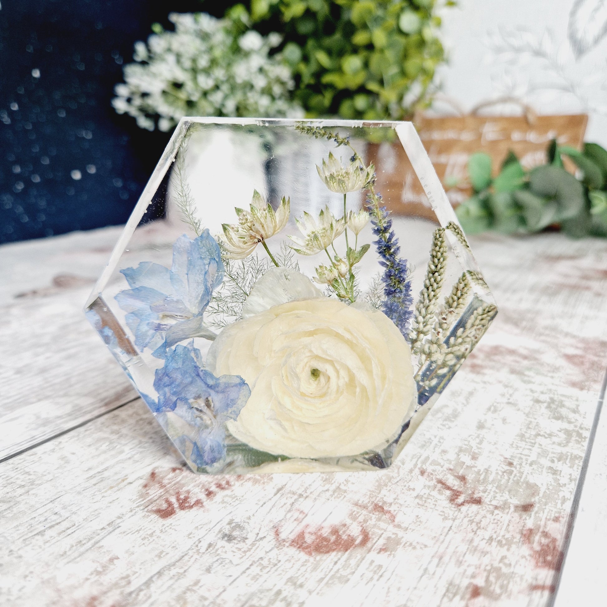 Introducing our 10cm x 3cm hexagon, perfect for displaying your cherished mementos from special occasions. Its freestanding design is suitable for collections of small flowers, making it a beautiful addition to any room. Celebrate life's moments with elegance and style.