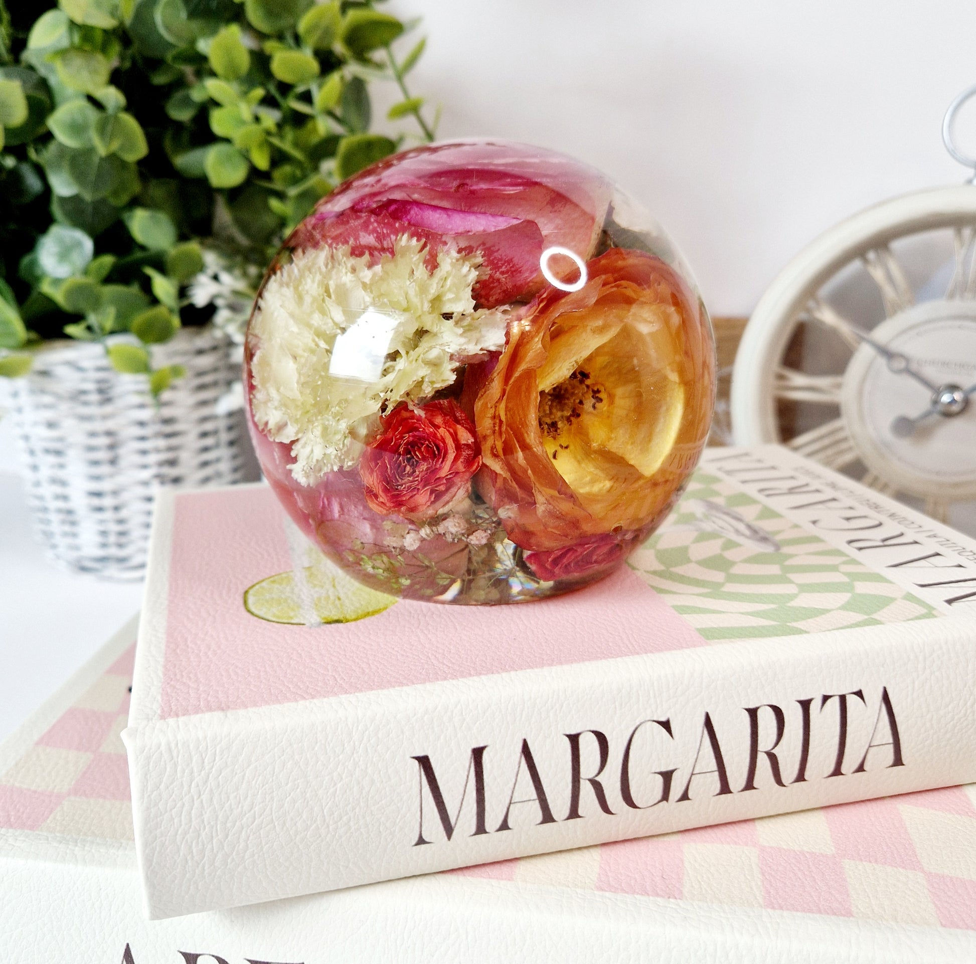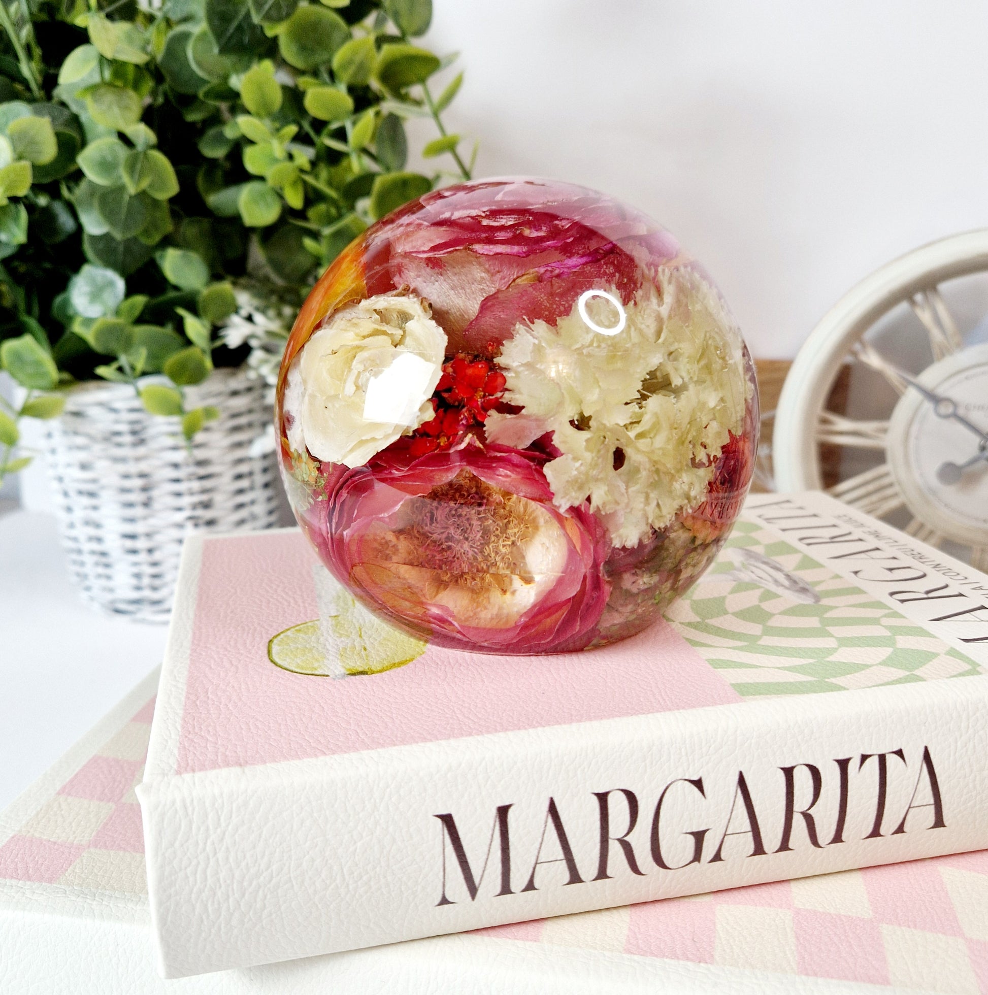 This includes the drying of your flowers so that they can be encapsulated inside the resin sphere is 13 cm wide and 11cm tall. I am also able to use your own dried flowers.