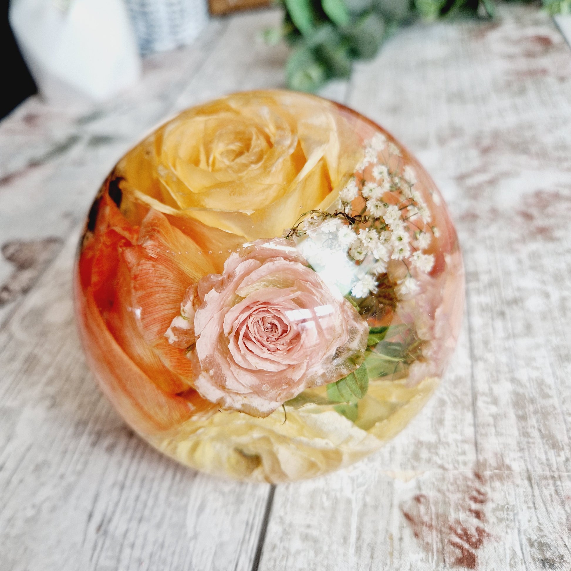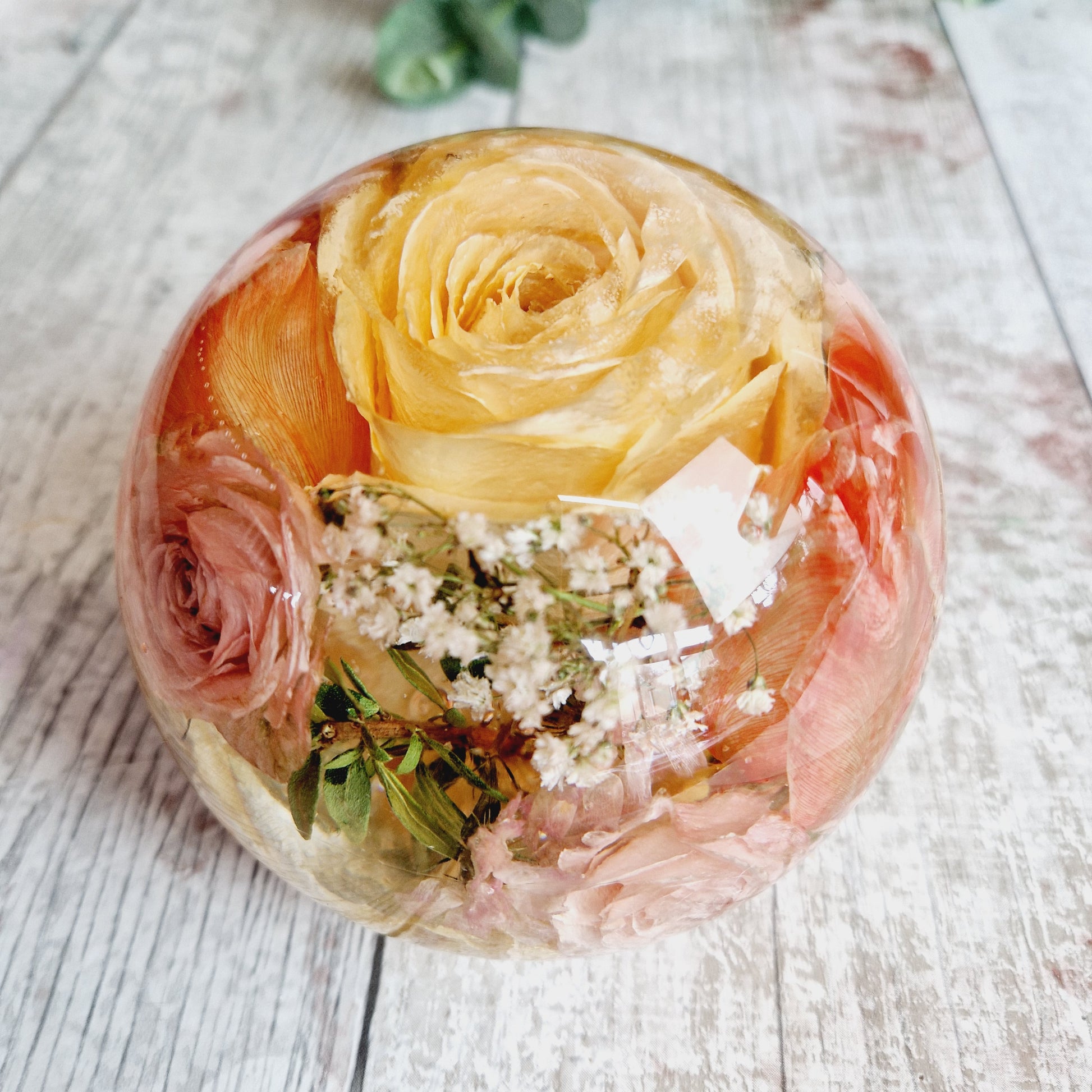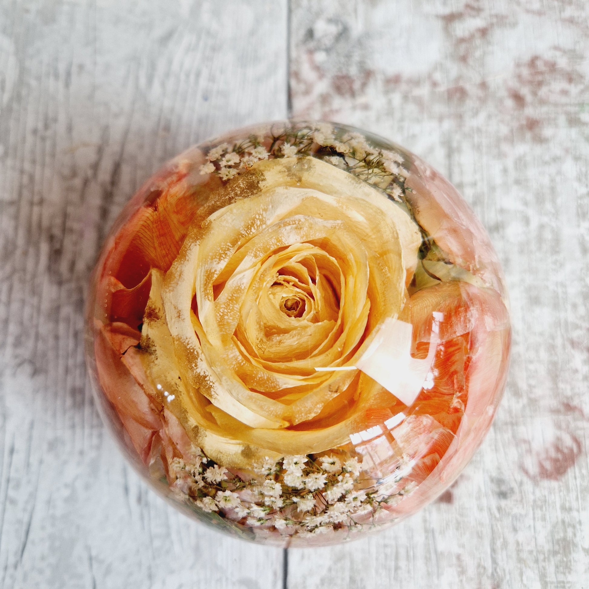 This listing is for a 13 cm wide and 11 cm tall Sphere flower preservation made from epoxy resin.