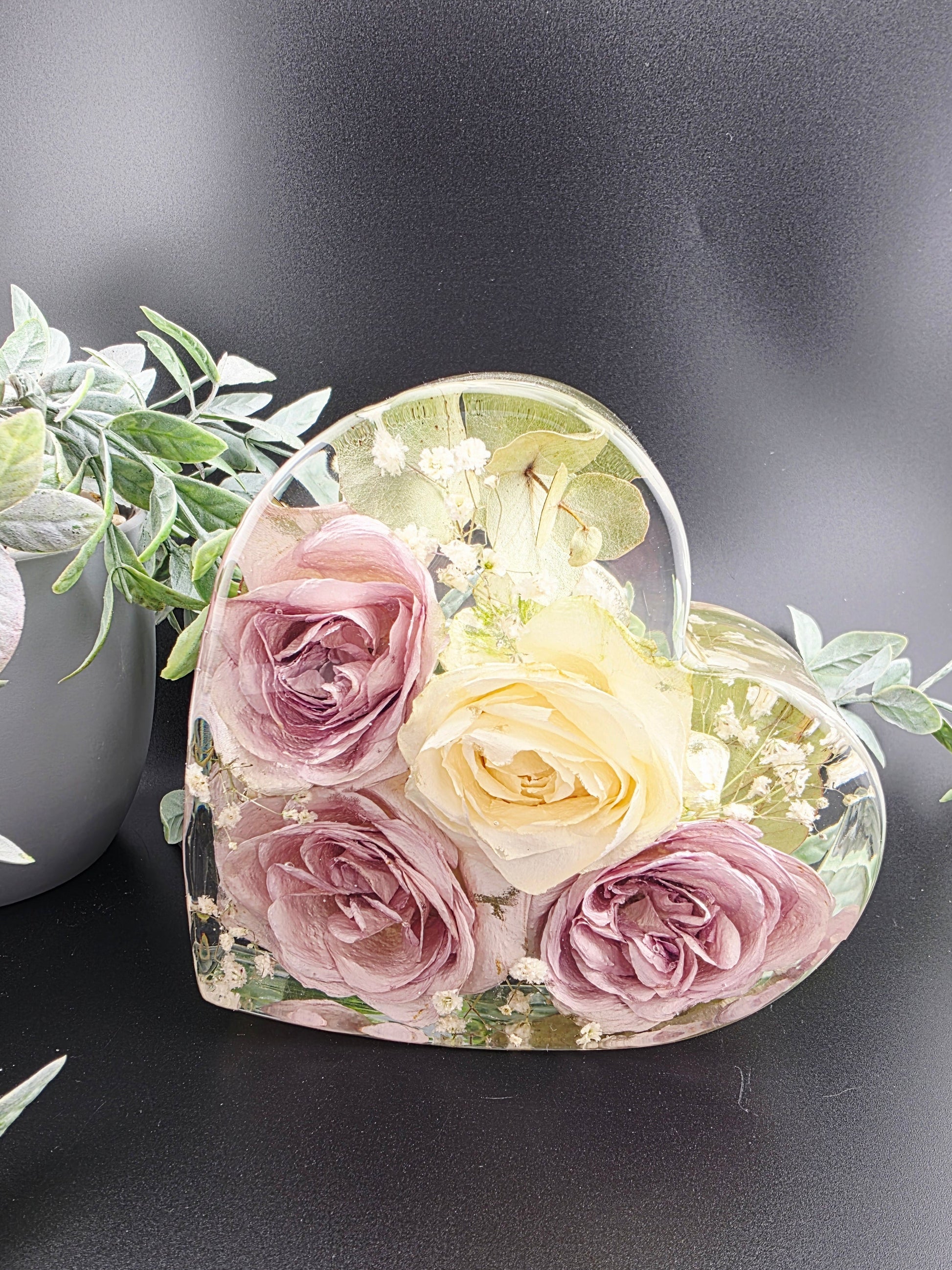 This 15cm x 5cm deep floral heart is a beautiful and elegant way to showcase your precious flowers from your wedding or any special occasion. With its intricate design, it adds a touch of sophistication and exclusivity to any display. Preserve your memories with this freestanding heart.