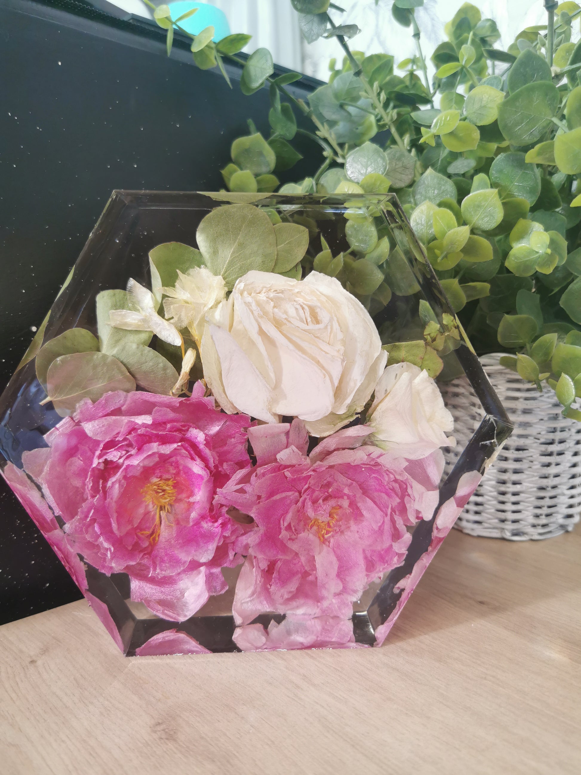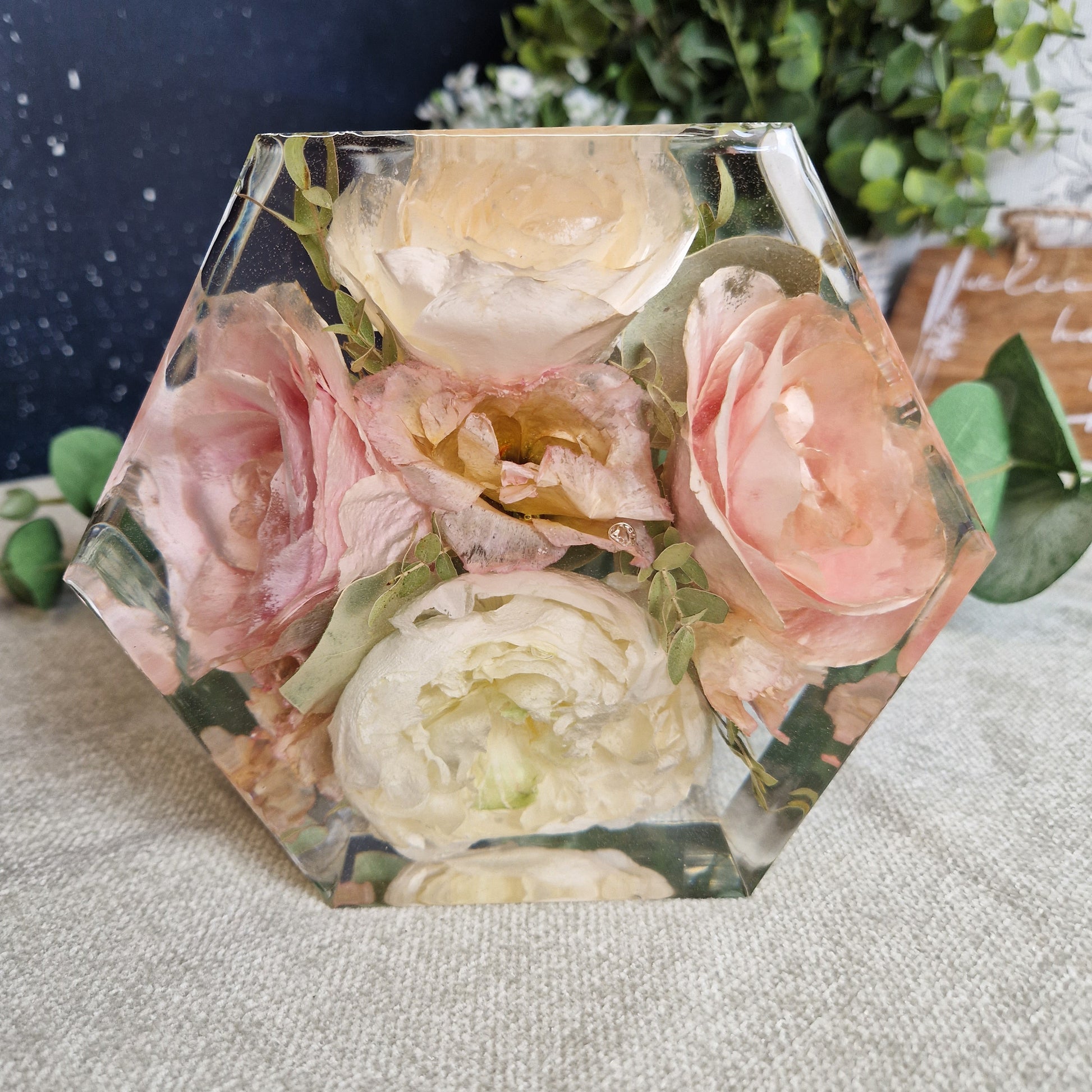 Display your most precious flowers in an elegant way with our 15cm Floral Hexagon. This 5cm deep hexagon is perfect for showcasing your wedding bouquet or funeral flowers. Add a touch of luxury to your home or event with this beautiful display option.