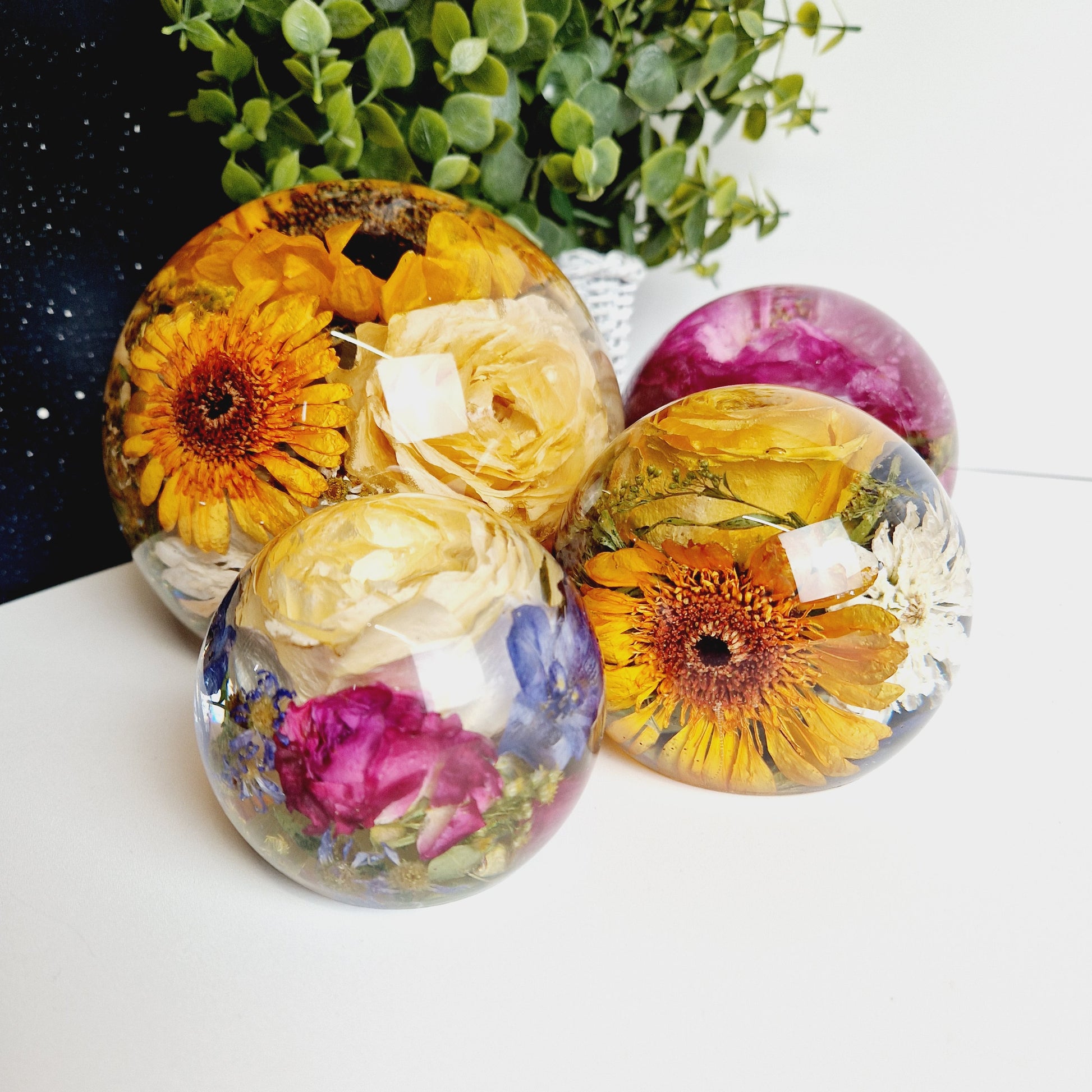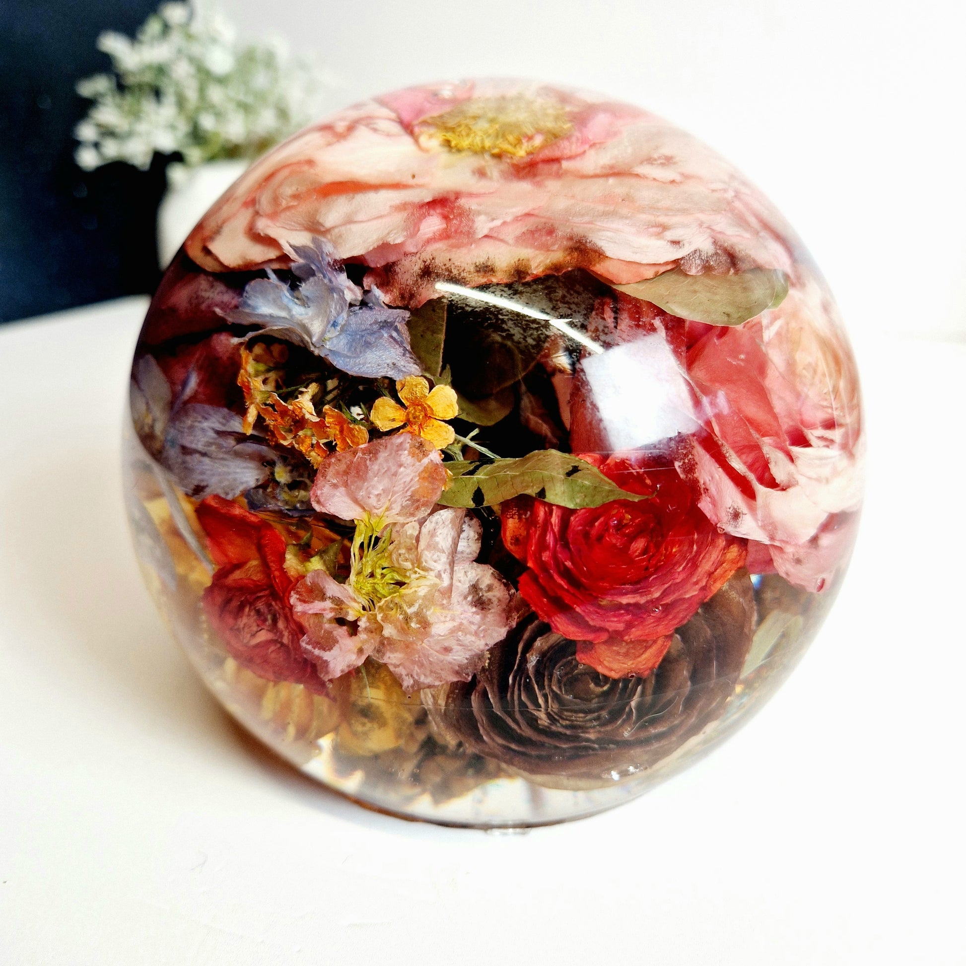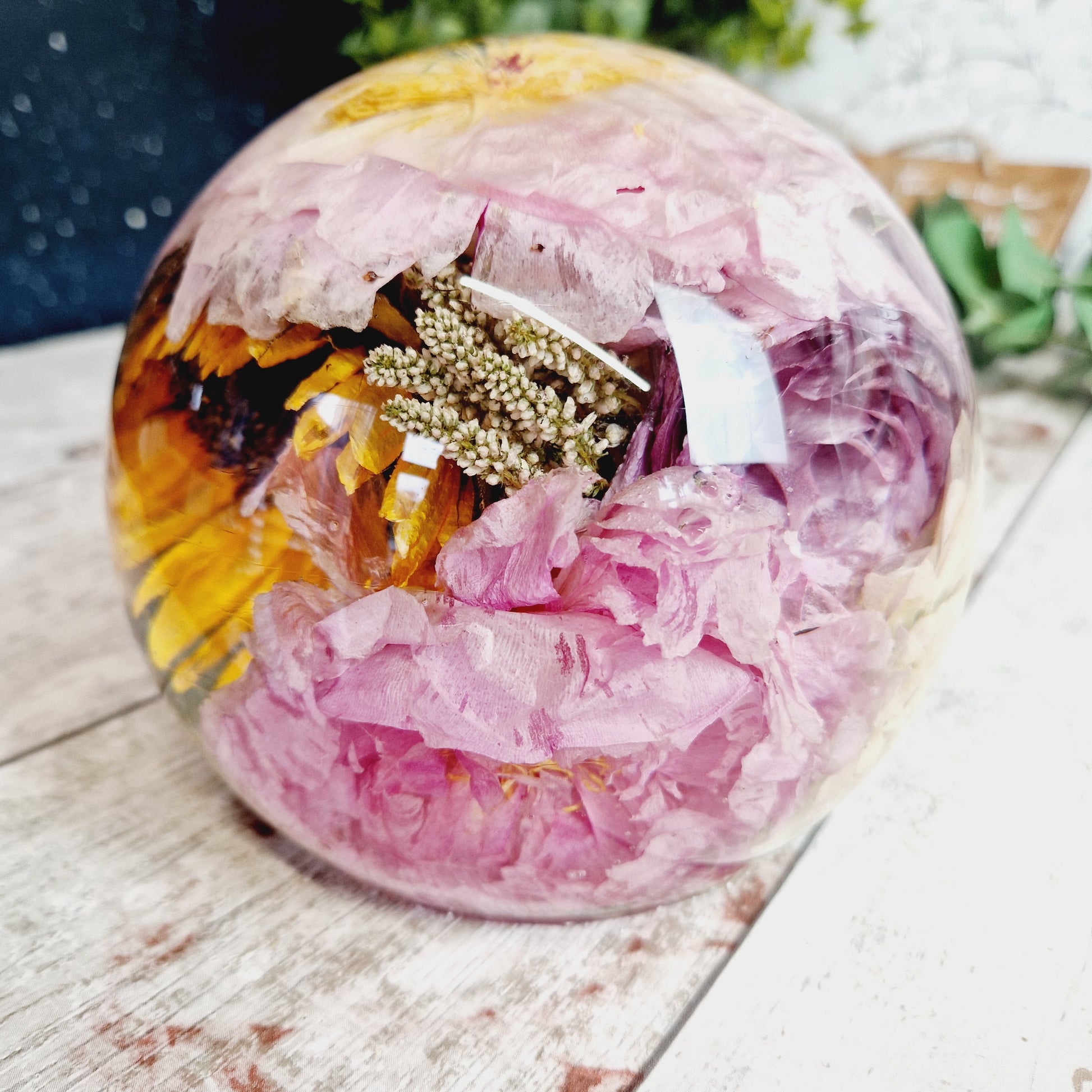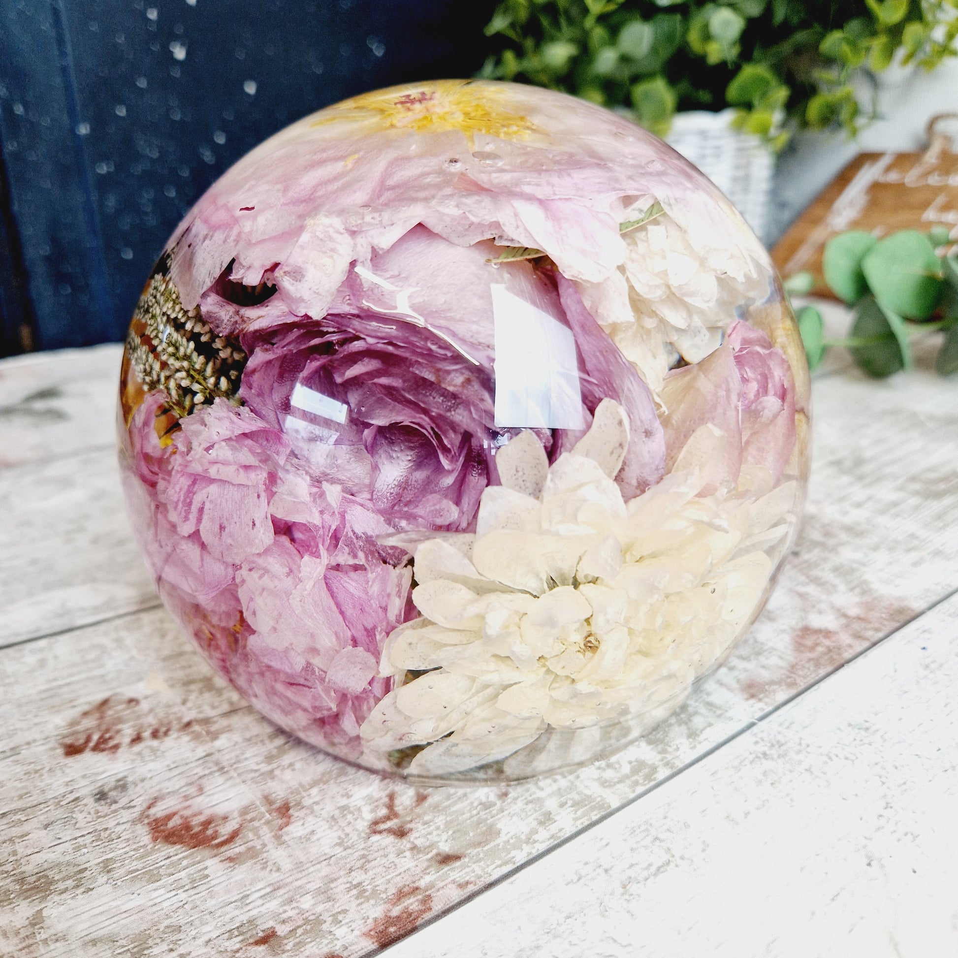 This includes the drying of your flowers so that they can be encapsulated inside the resin sphere. I am also able to use your own dried flowers.