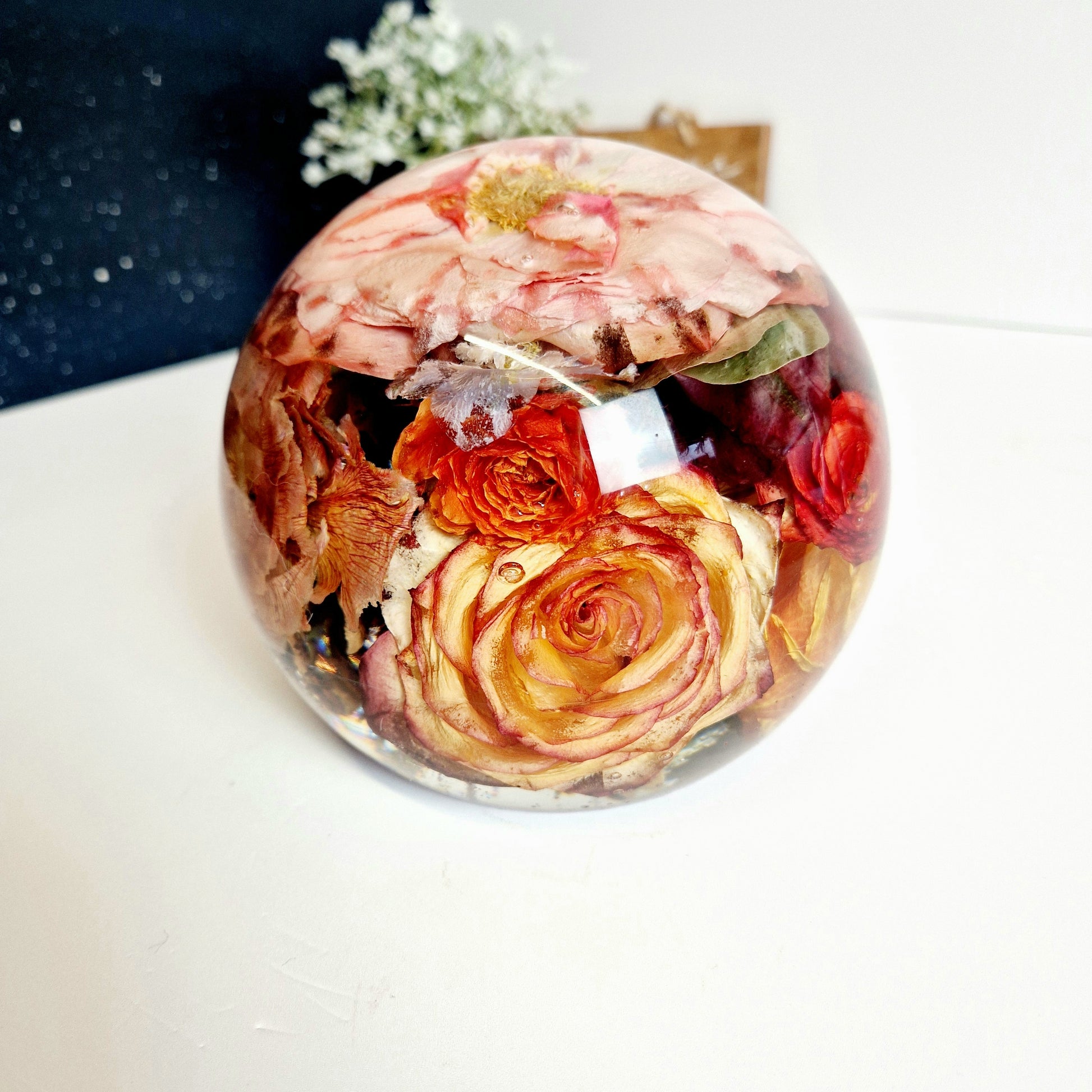 This listing is for a 18cm Sphere flower preservation made from epoxy resin.