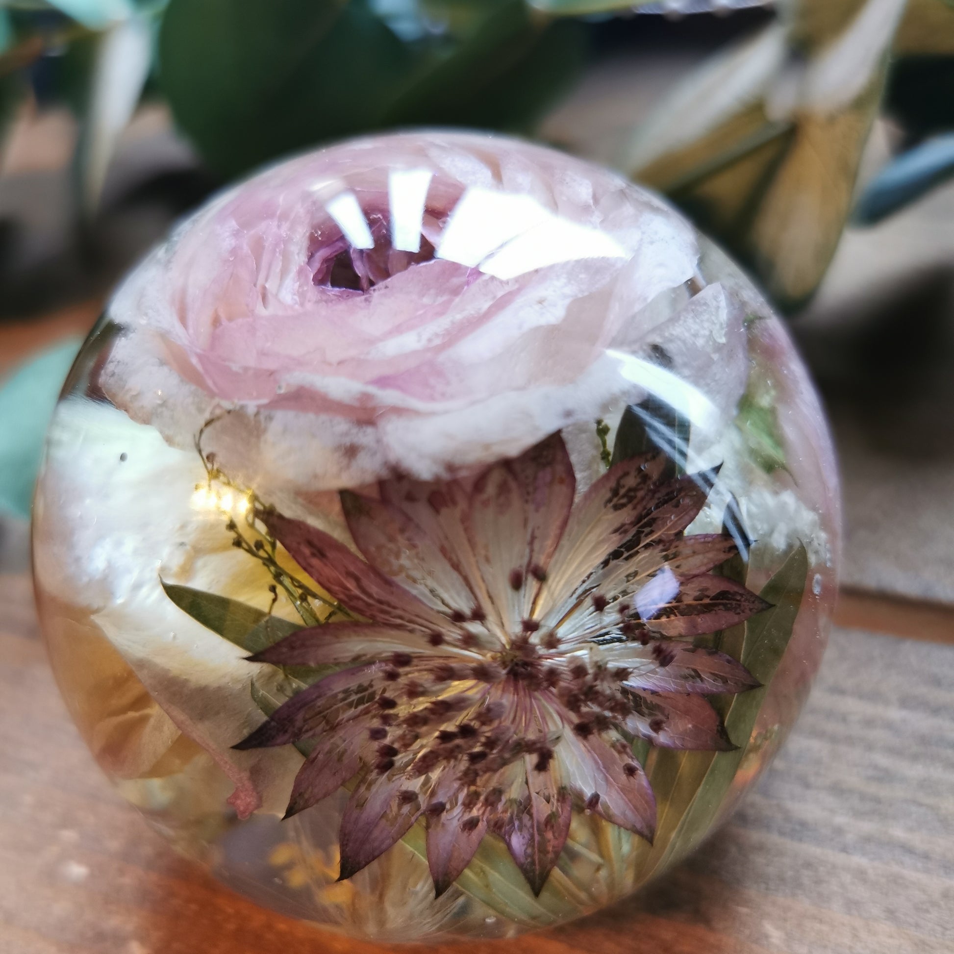 This includes the drying of your flowers so that they can be encapsulated inside the resin sphere is 8cm . I am also able to use your own dried flowers.