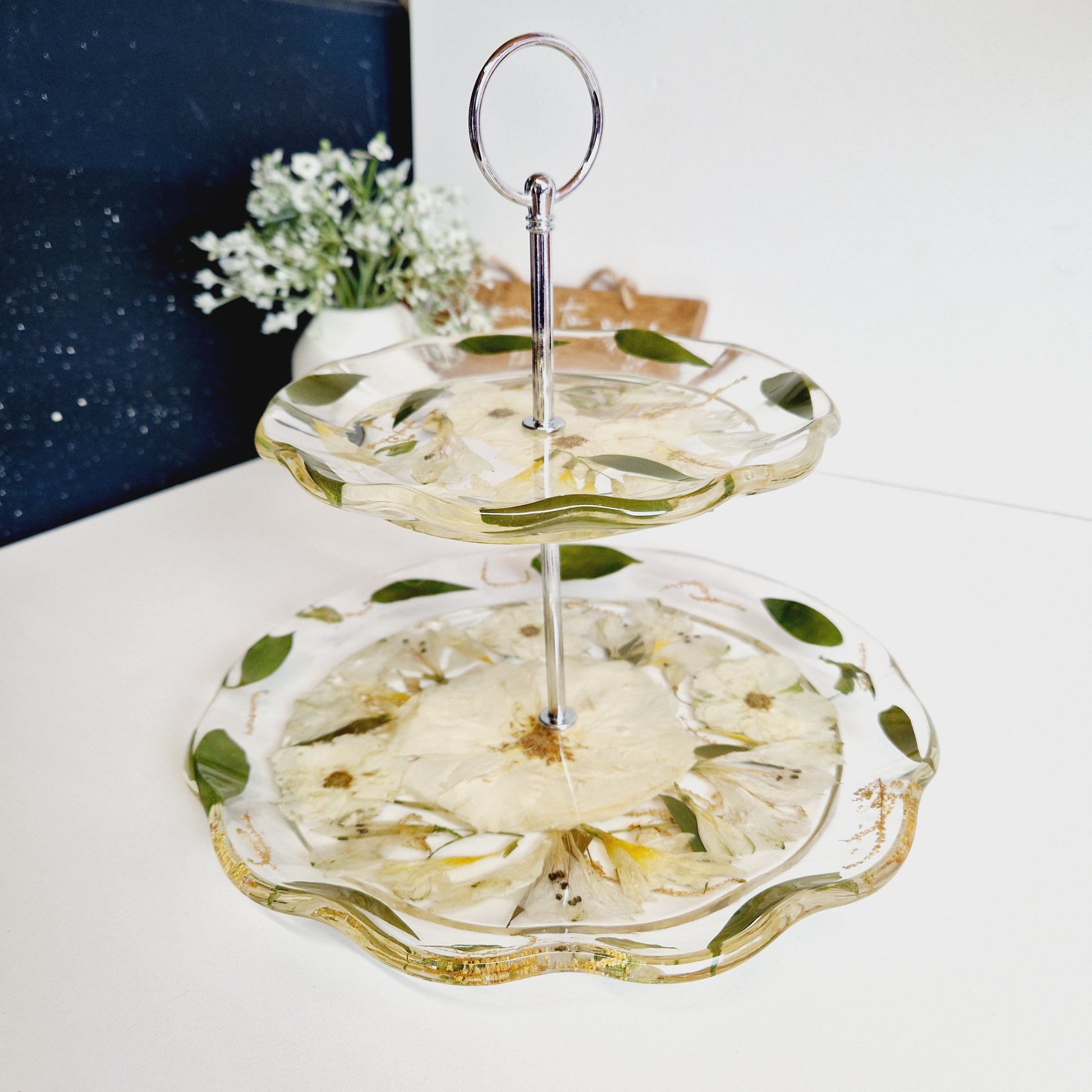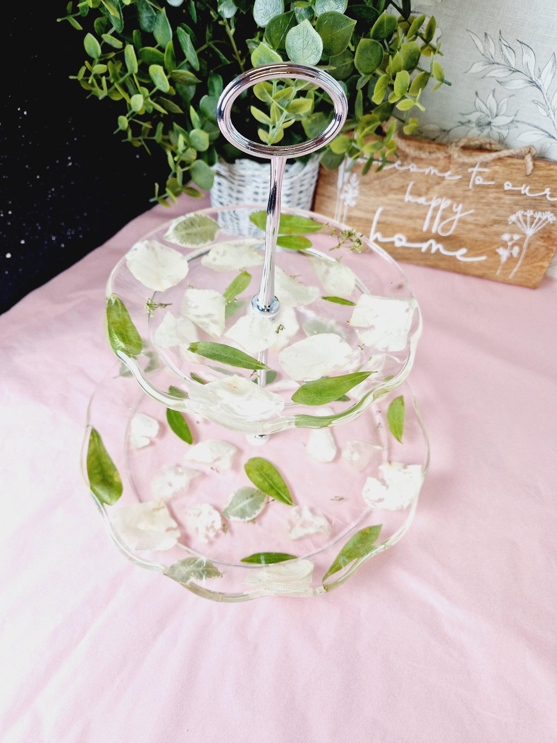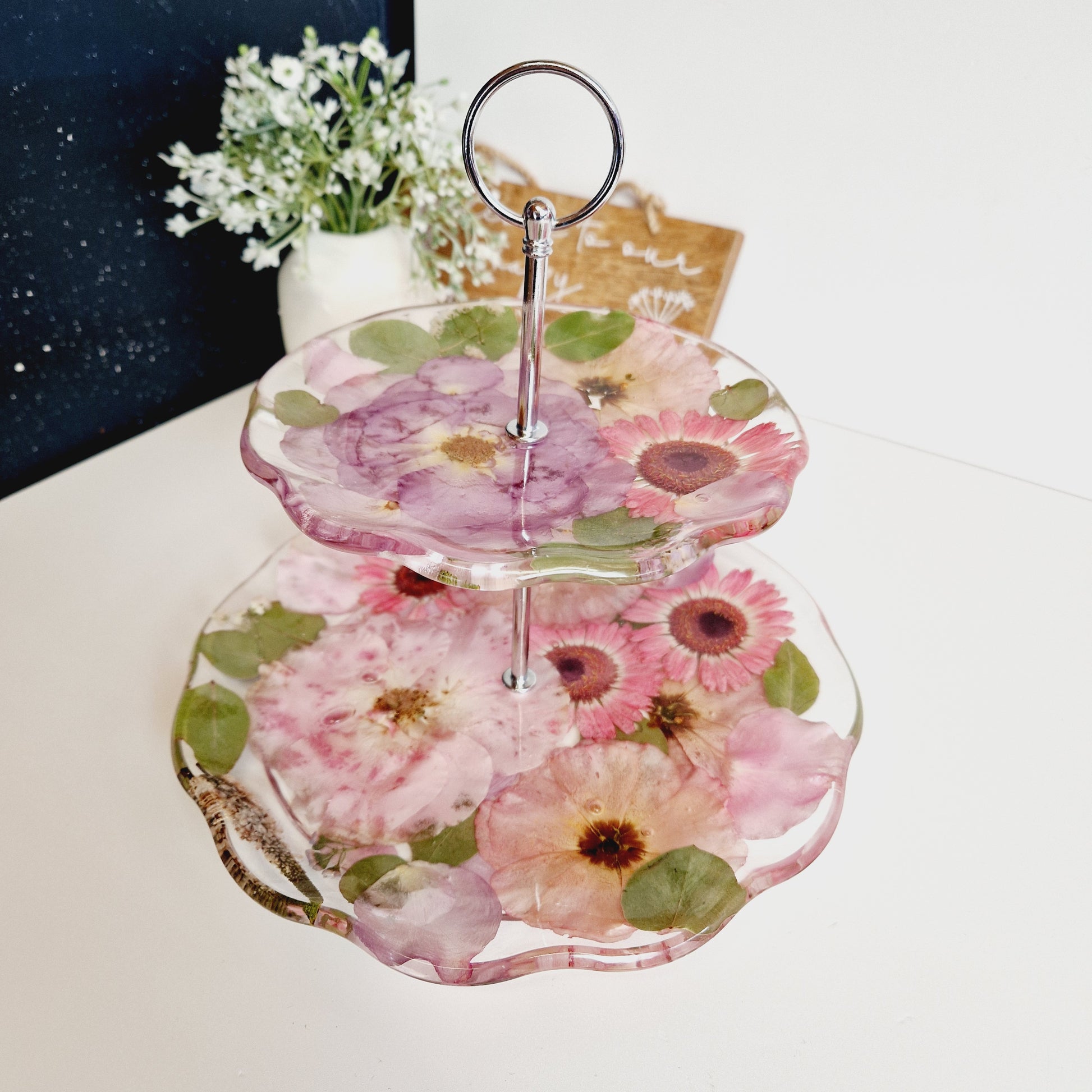 Beautiful 2 tier cake stand made from small flowers or petals.