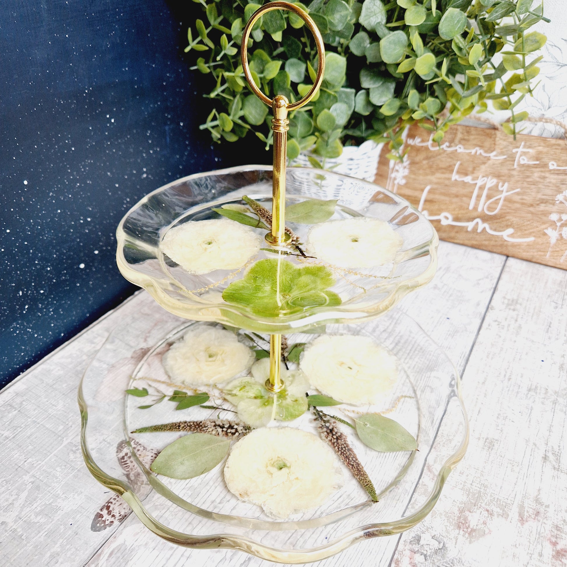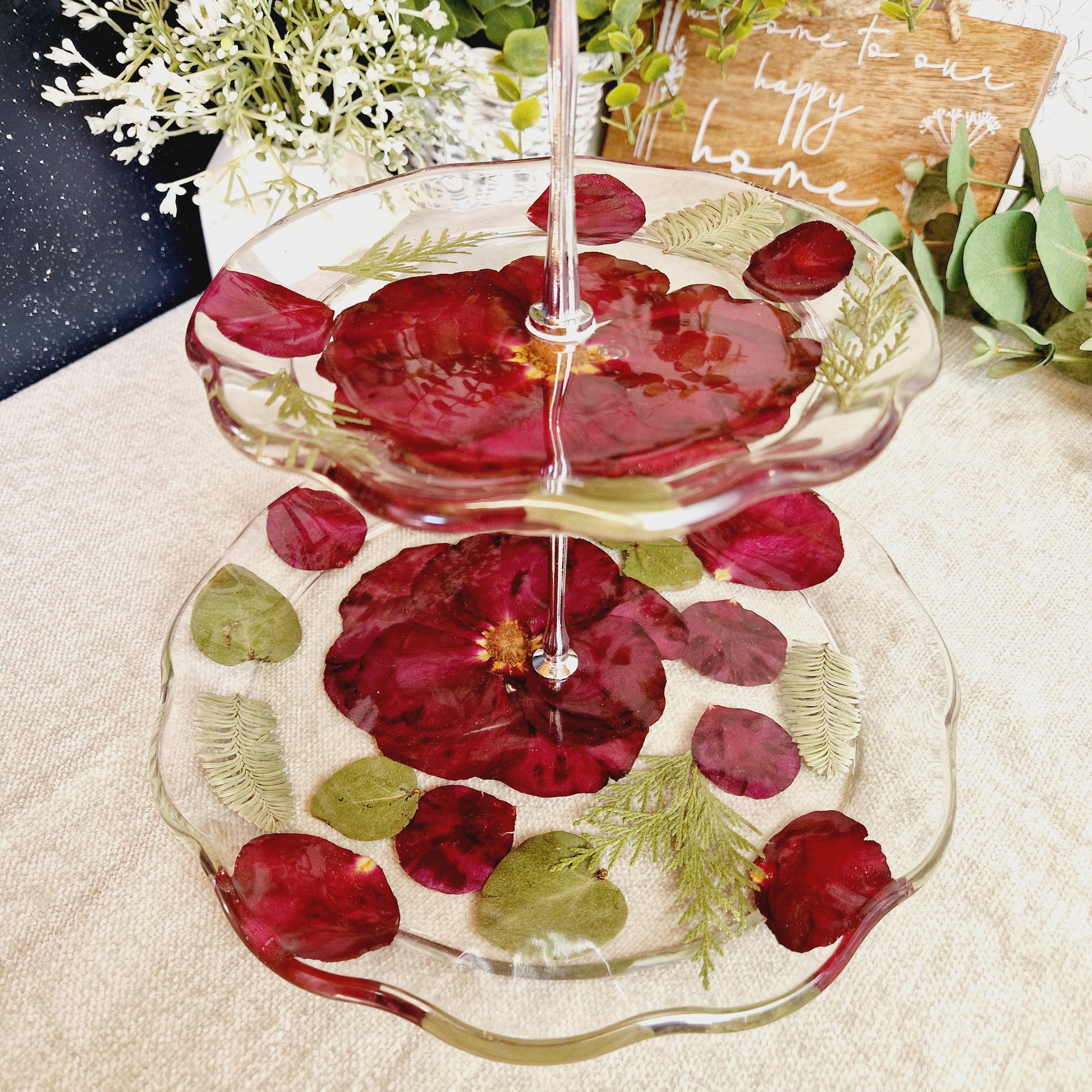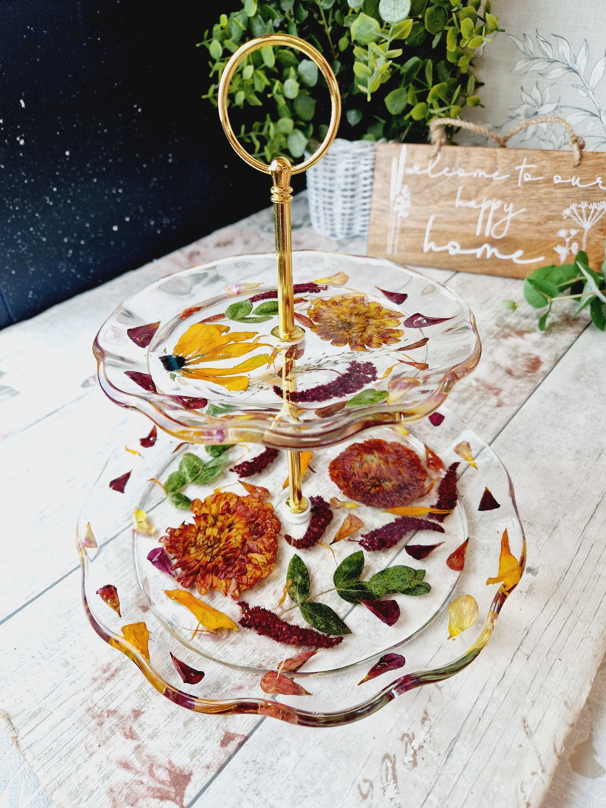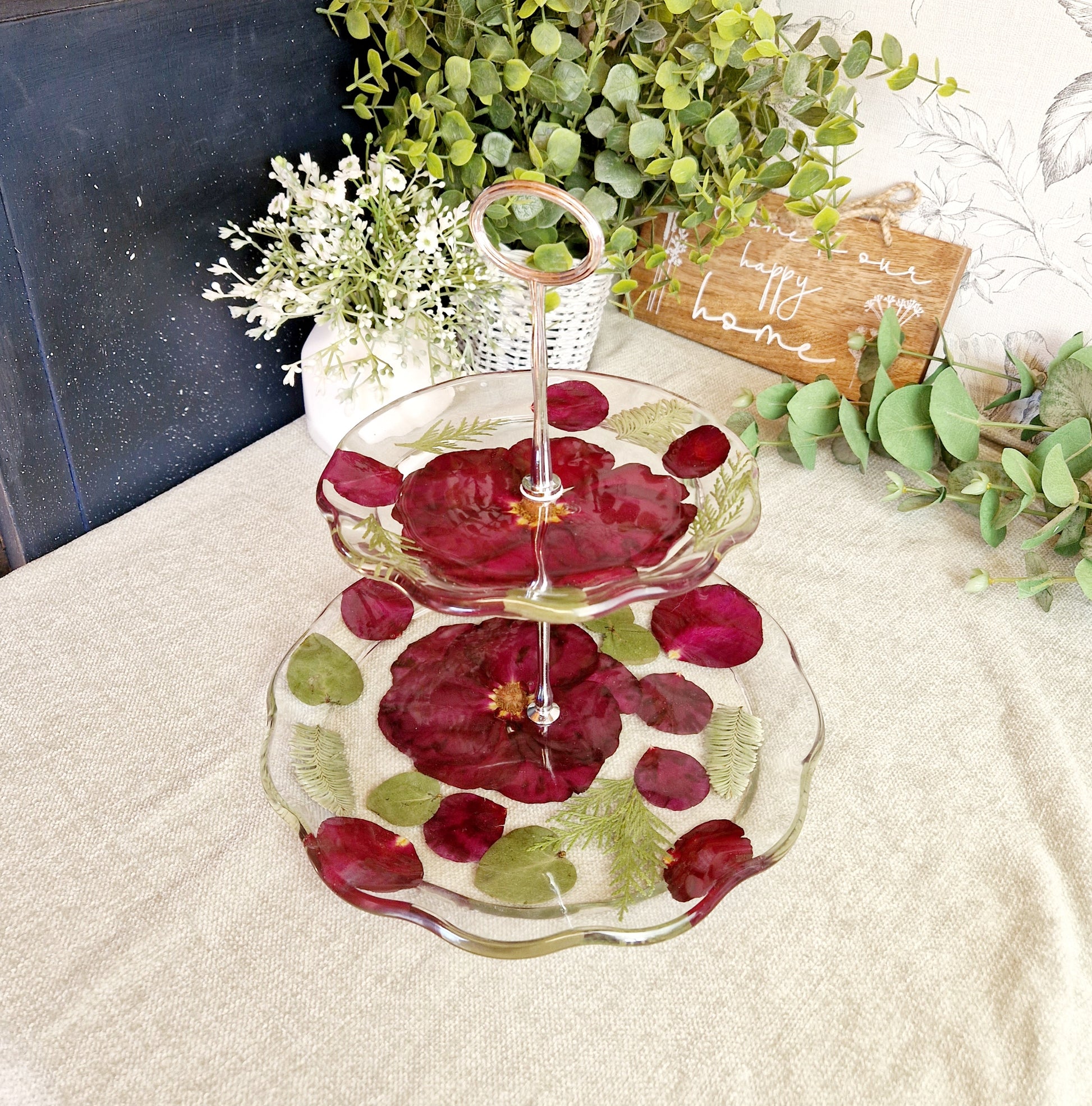 Beautiful 2 tier cake stand made from small flowers or petals.