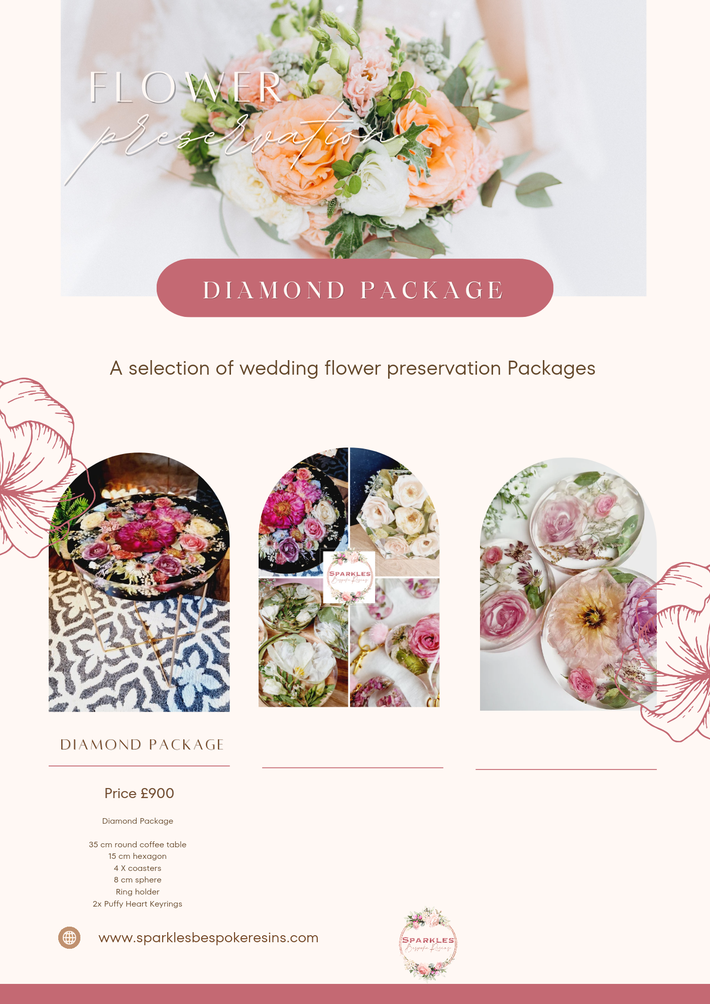 Unlock the ultimate experience with our Diamond package. Indulge in the luxury of preserving your wedding flowers, transforming them into timeless keepsakes to forever cherish your special day. Immerse yourself in the beauty and elegance of our most exquisite items. Elevate your memories with the Diamond package.