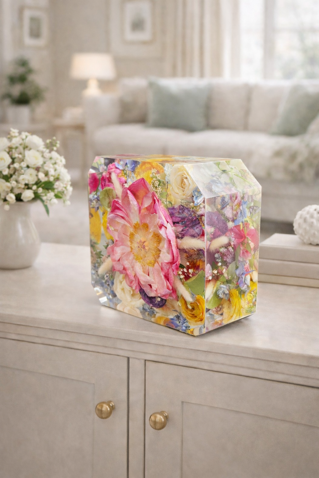 Each Emerald block is hand poured with care. The angular edges catch the light beautifully, making this piece a timeless keepsake for your home. Perfect for preserving bridal bouquets, memorial flowers, and other sentimental blooms, this piece is designed to be displayed on shelves, sideboards, or coffee tables.
