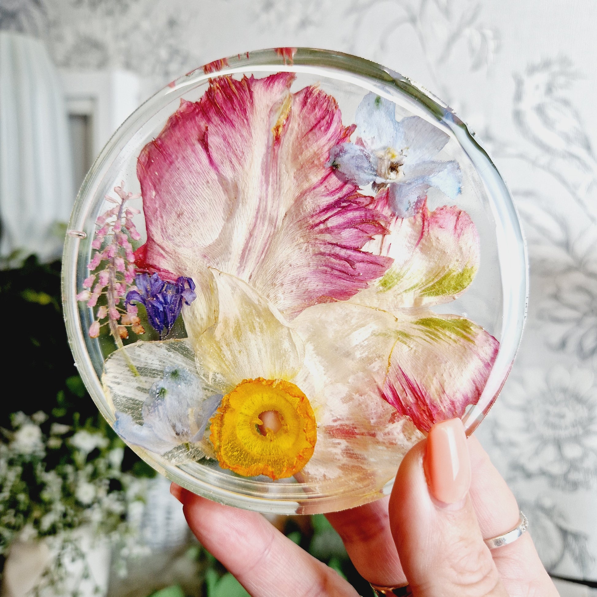 This includes the drying of your flowers so that they can be encapsulated inside the resin coaster 11 by 2.cm deep. I am also able to use your own dried flowers.
