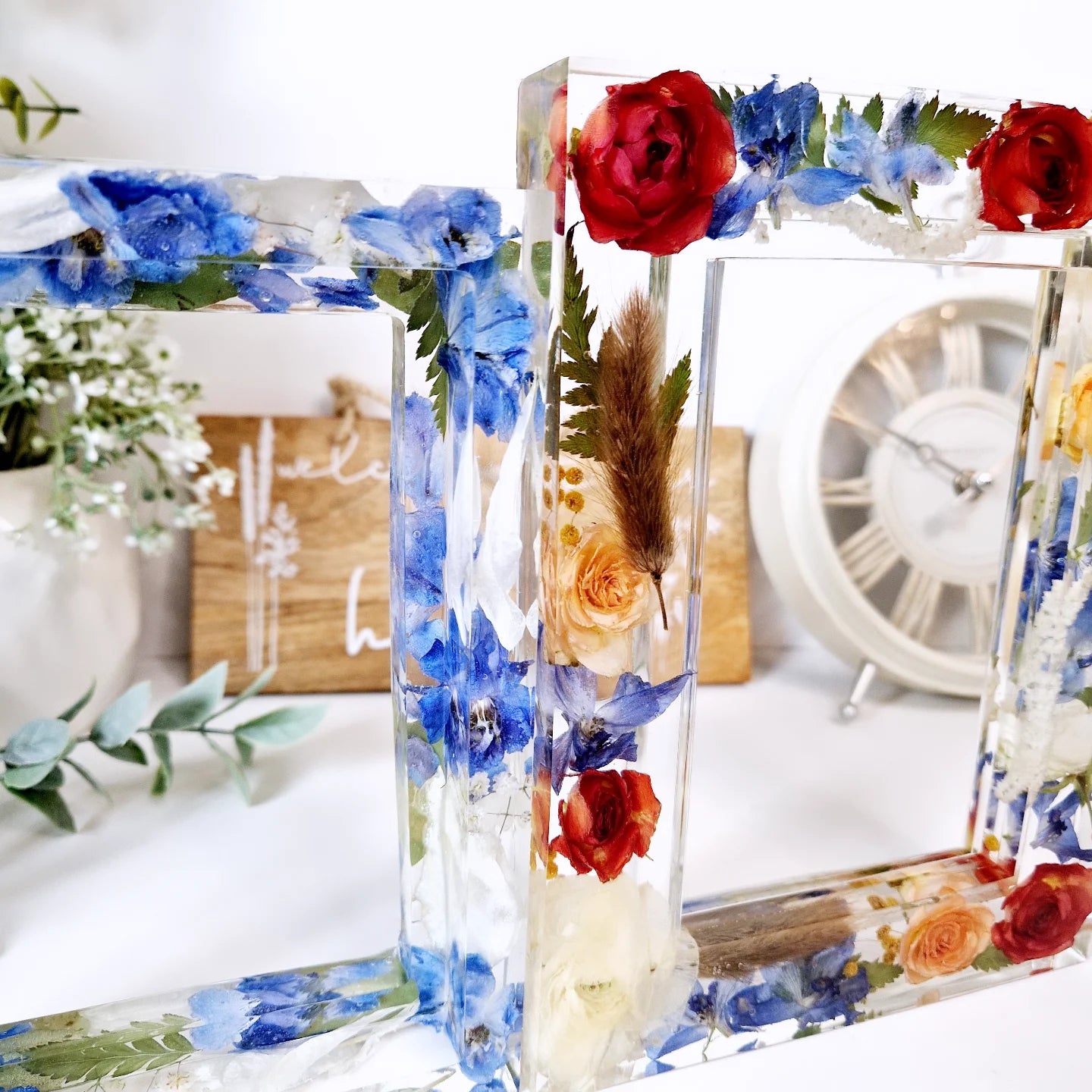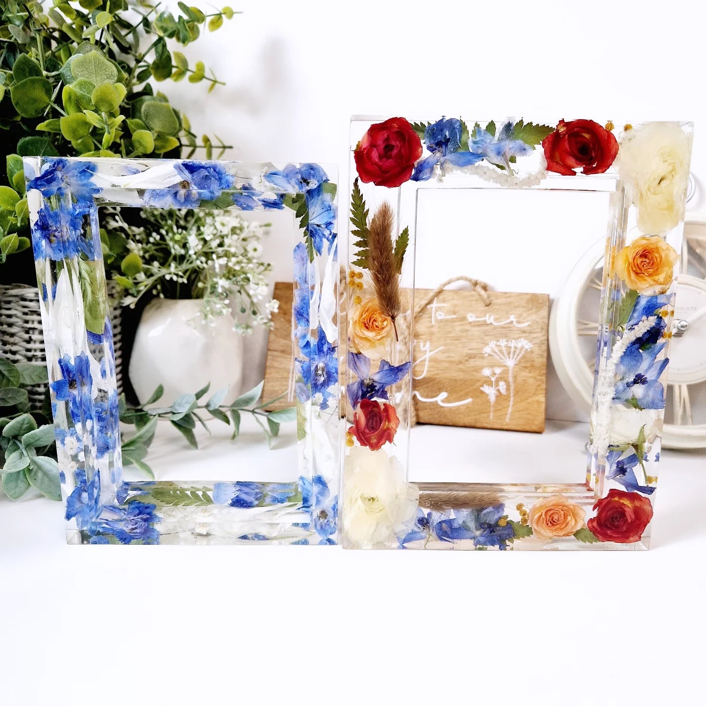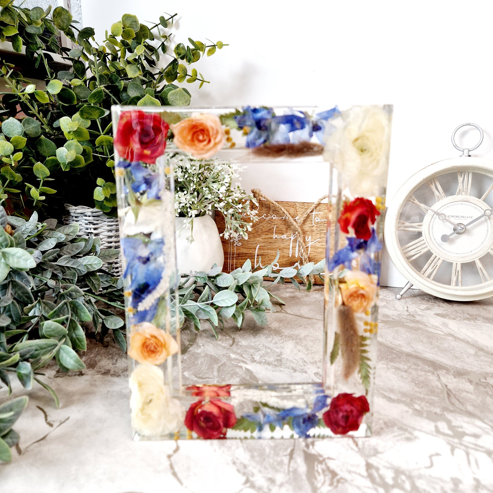 Our New improved photo frames. These are a bigger version of our other photo frame options. These are a more solid frame with wider spacing so we can fit more of the flowers or petals. These stand on their own without the need of a backing board. You will be supplied with glue dots pads to add your photo to the photo frame. We recommend laminating your photo to help protect it.