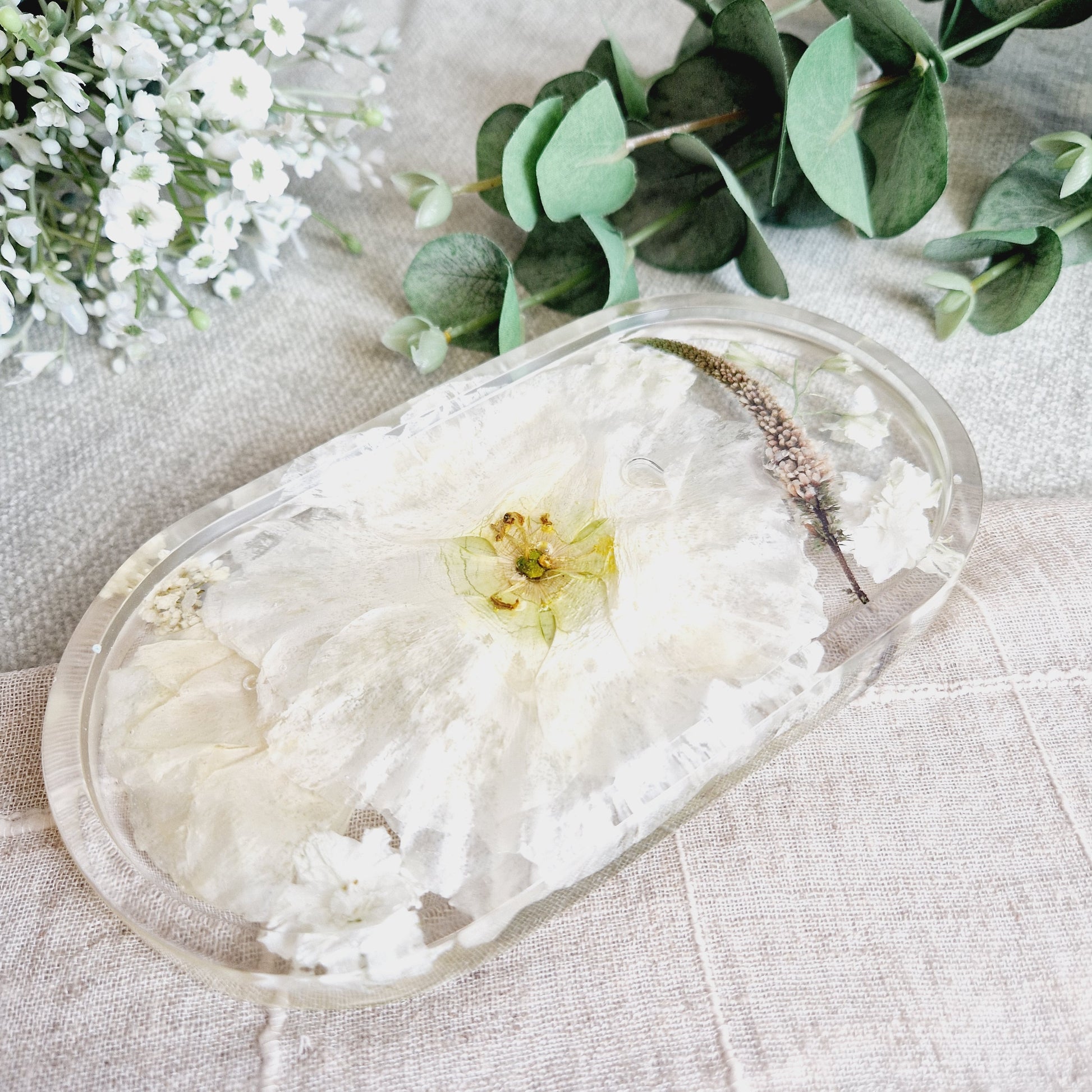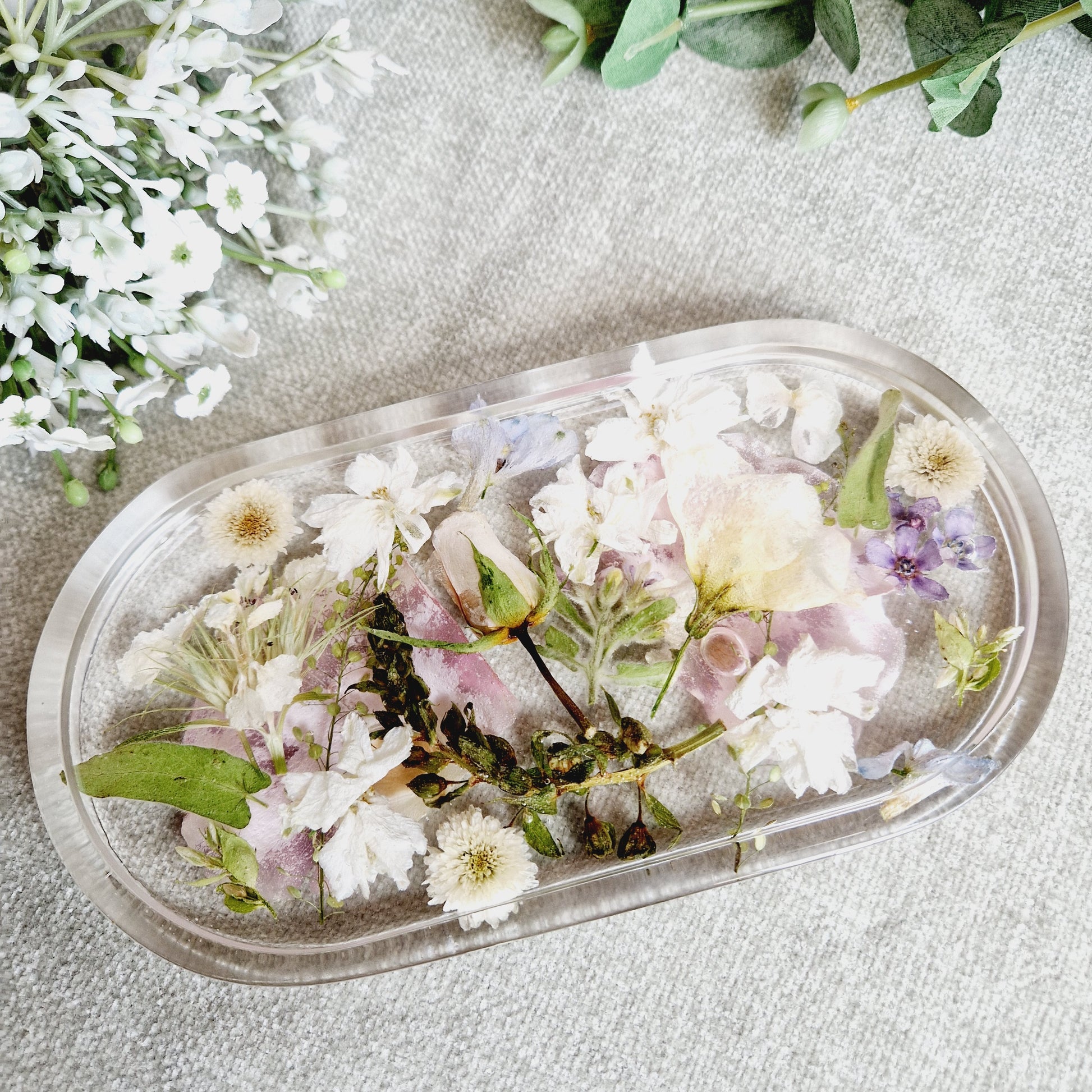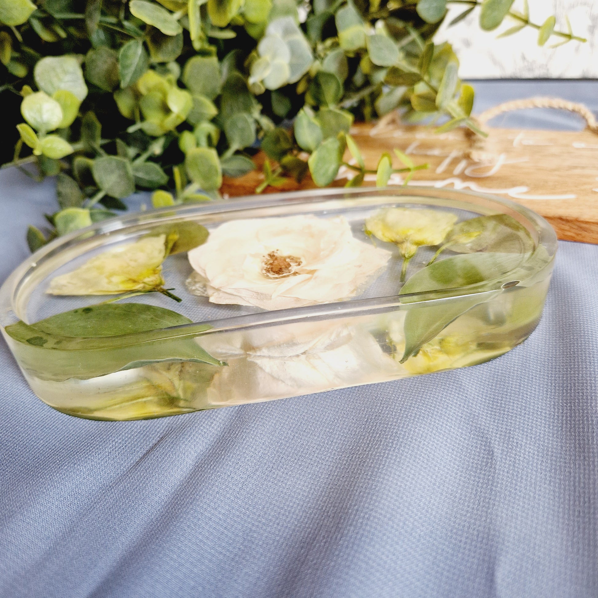 This stylish oval deep floral trinket dish is perfect for presenting flat flowers or petals in a sophisticated, tasteful way. Its elegant shape and subtle texture will help it to stand out in any setting, whether it is in your home or as an aesthetically pleasing center piece on your coffee table.