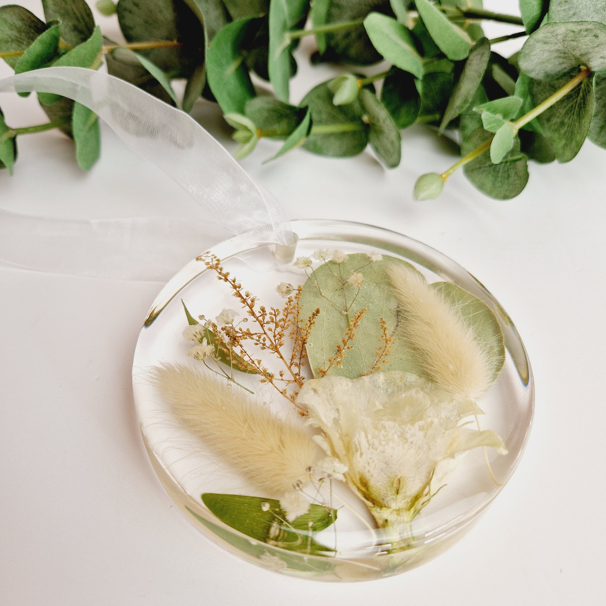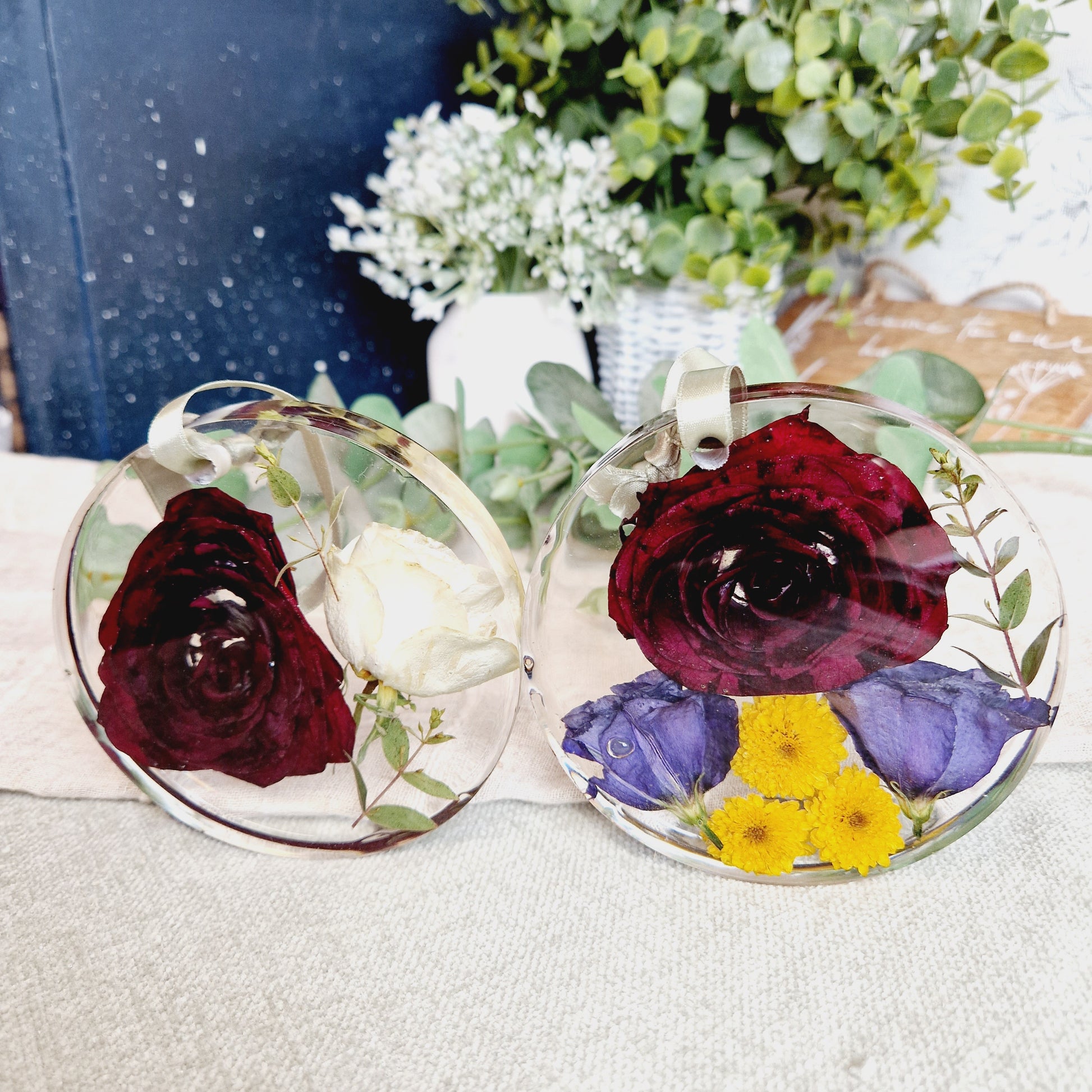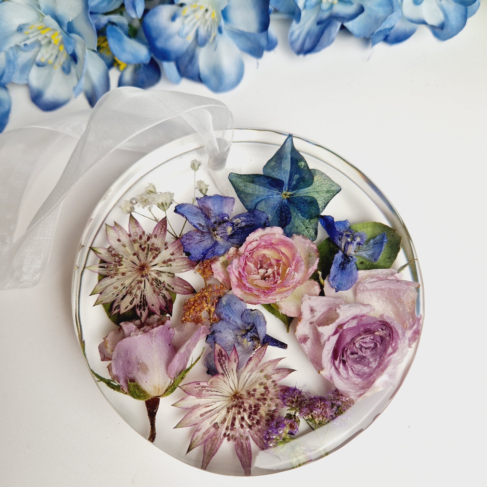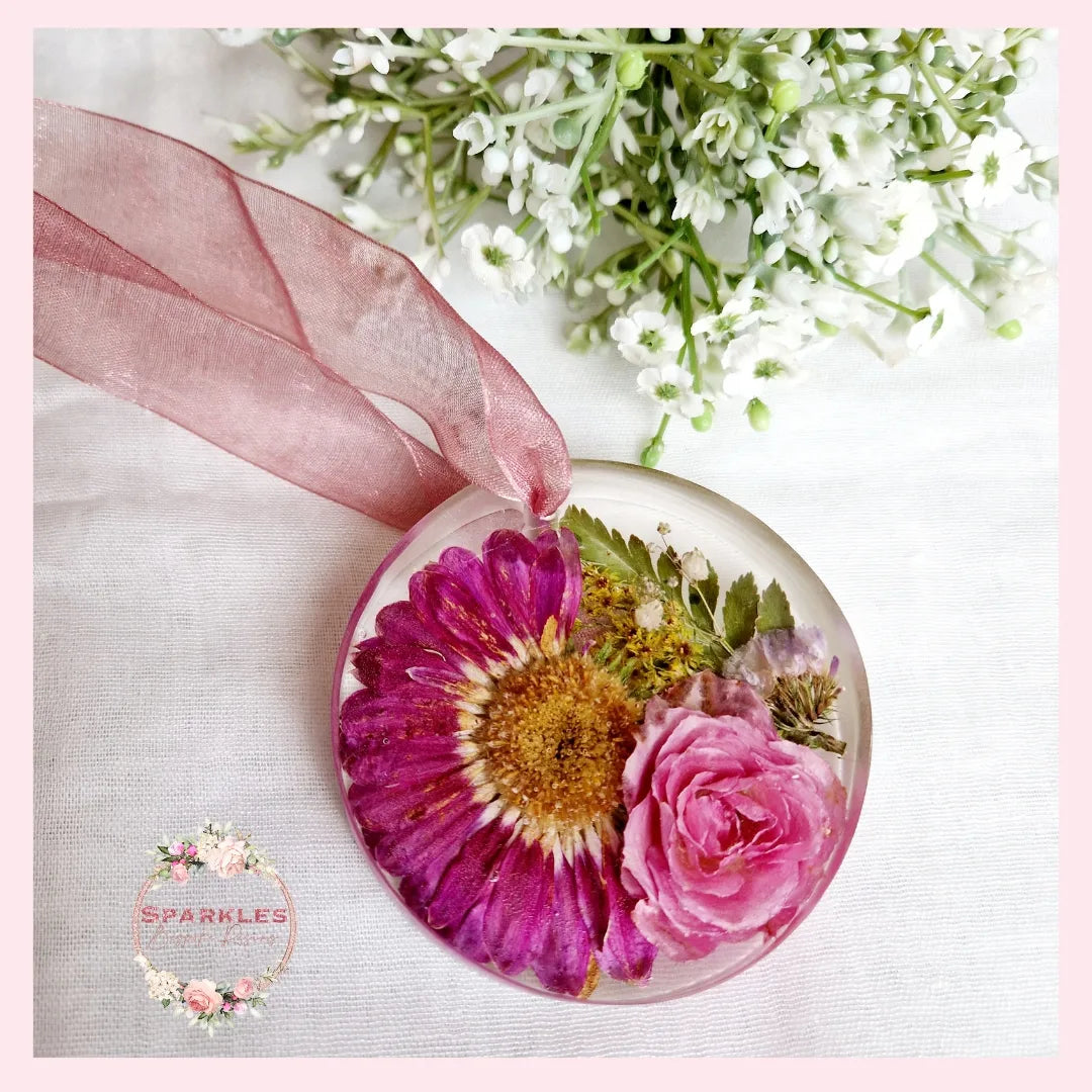 Beautiful floral keepsake made with preserved flowers. These beautiful hanging decorations will come with ribbon suited to compliment the colour of your flowers.