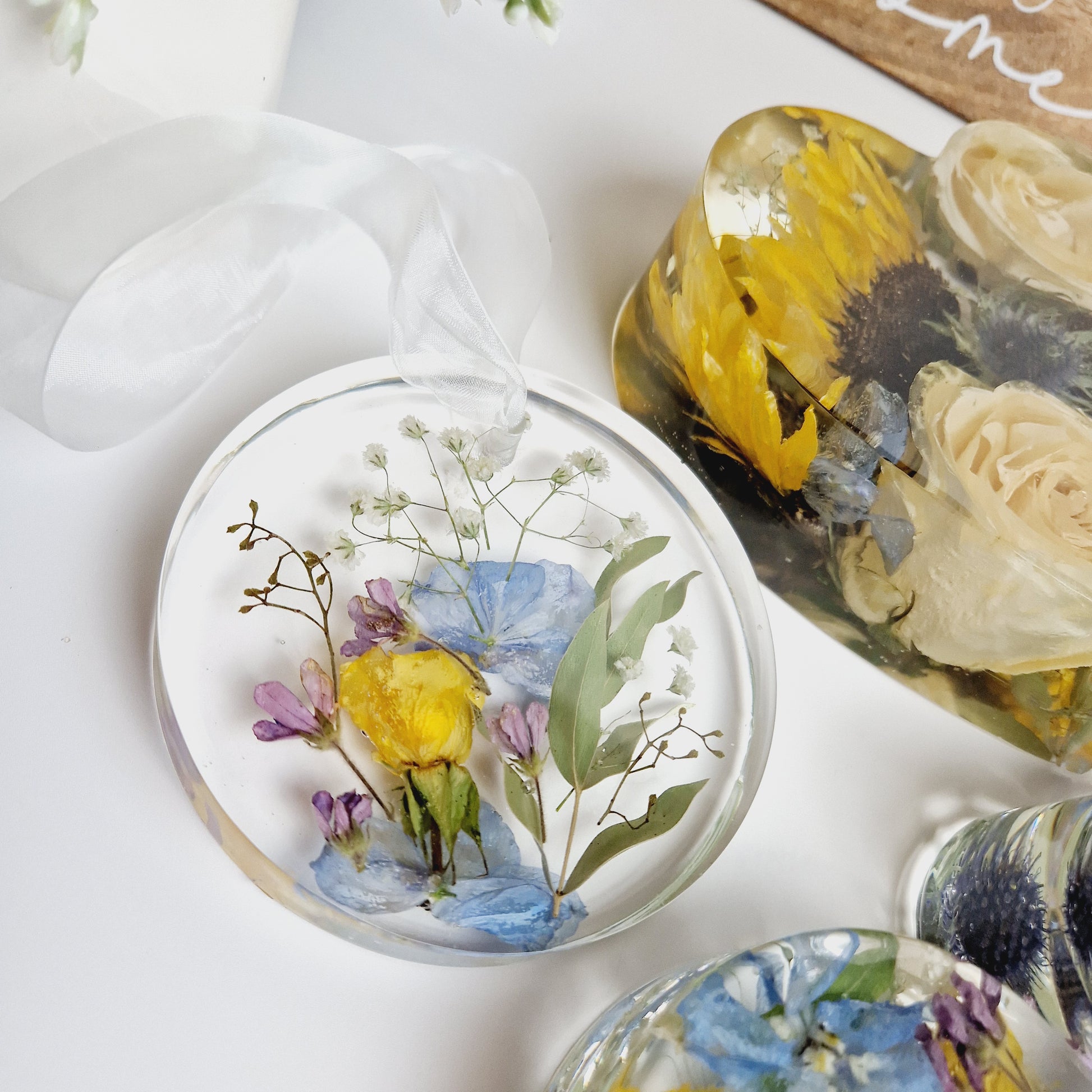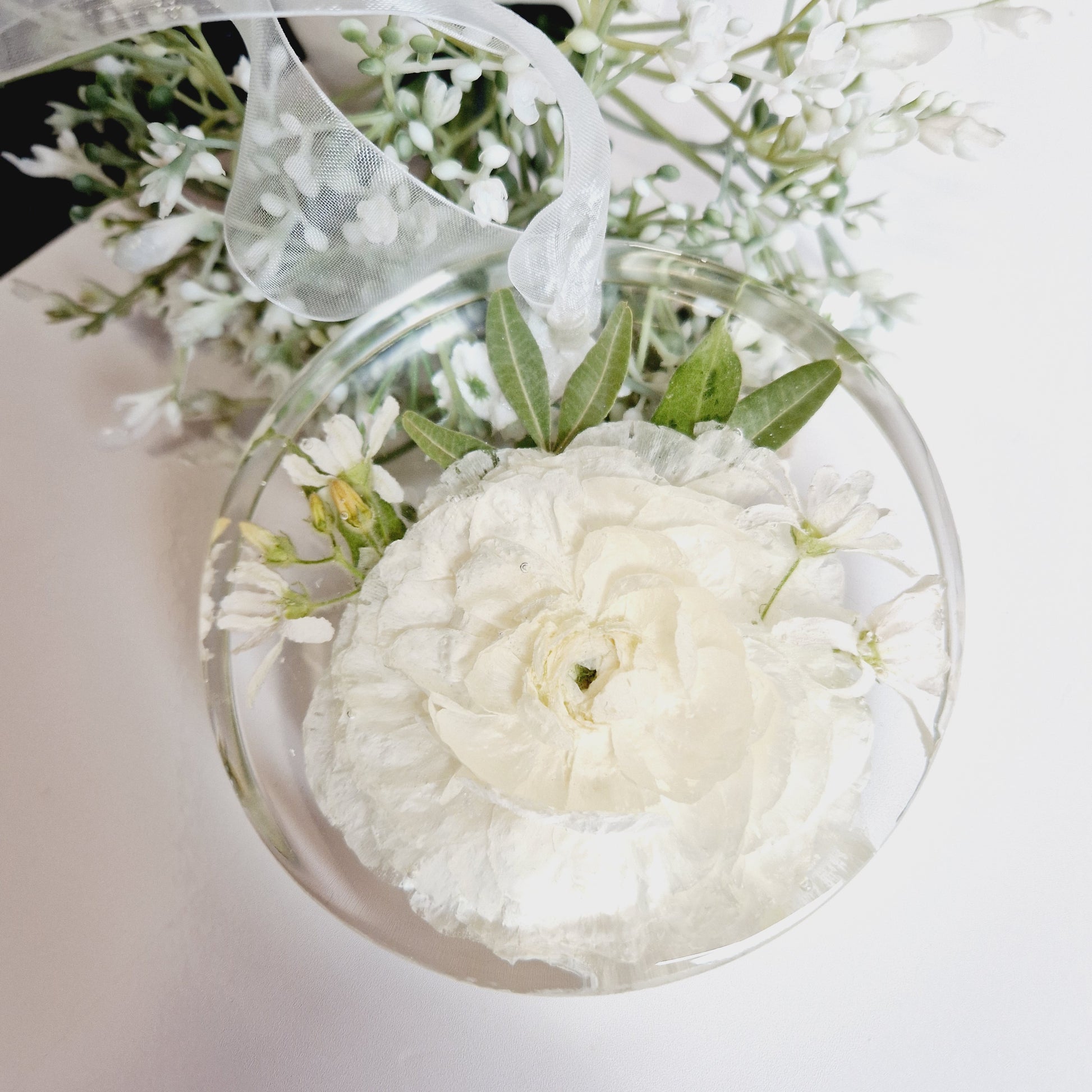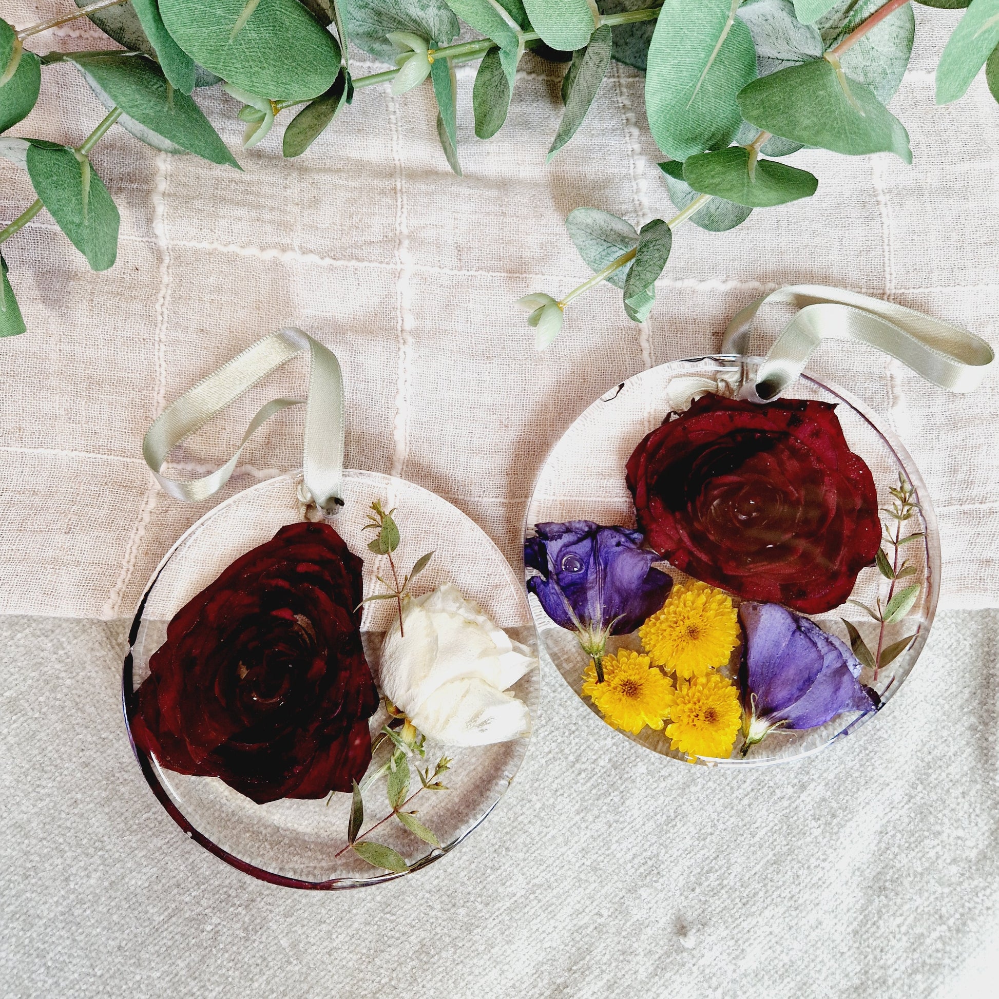Beautiful floral keepsake made with preserved flowers. These beautiful hanging decorations will come with ribbon suited to compliment the colour of your flowers.