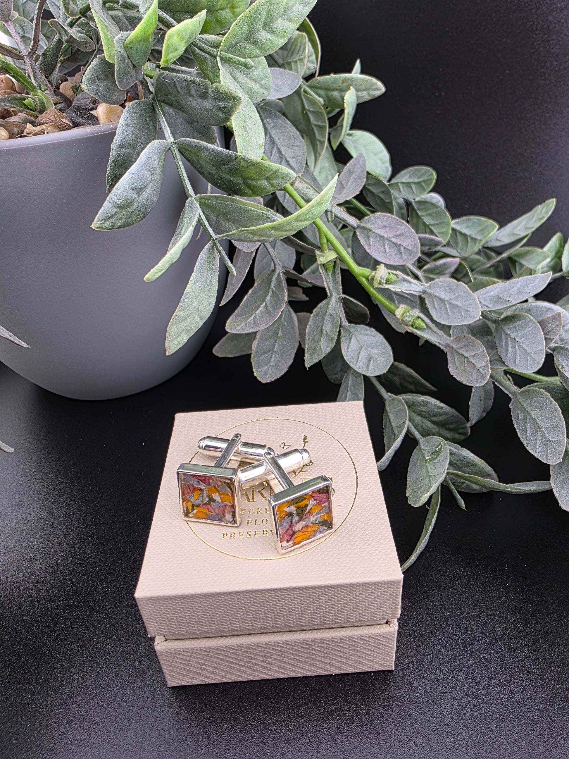 These square cufflinks are crafted from solid sterling silver and tailored to your specifications. Designed to elegantly incorporate ash, hair, or fur, they offer a personalized touch that honors cherished memories. Their refined simplicity makes them a distinguished accessory for any formal occasion.