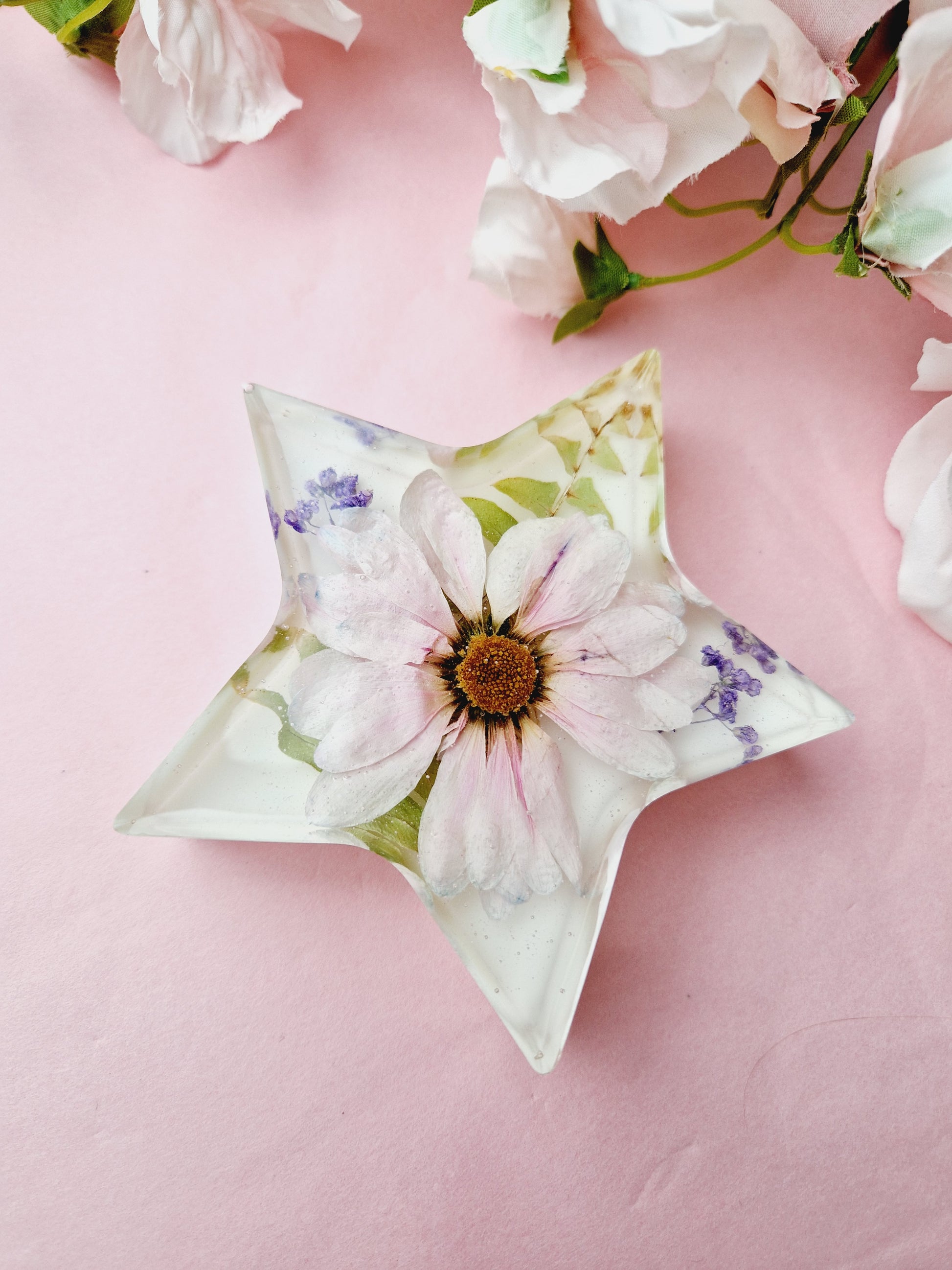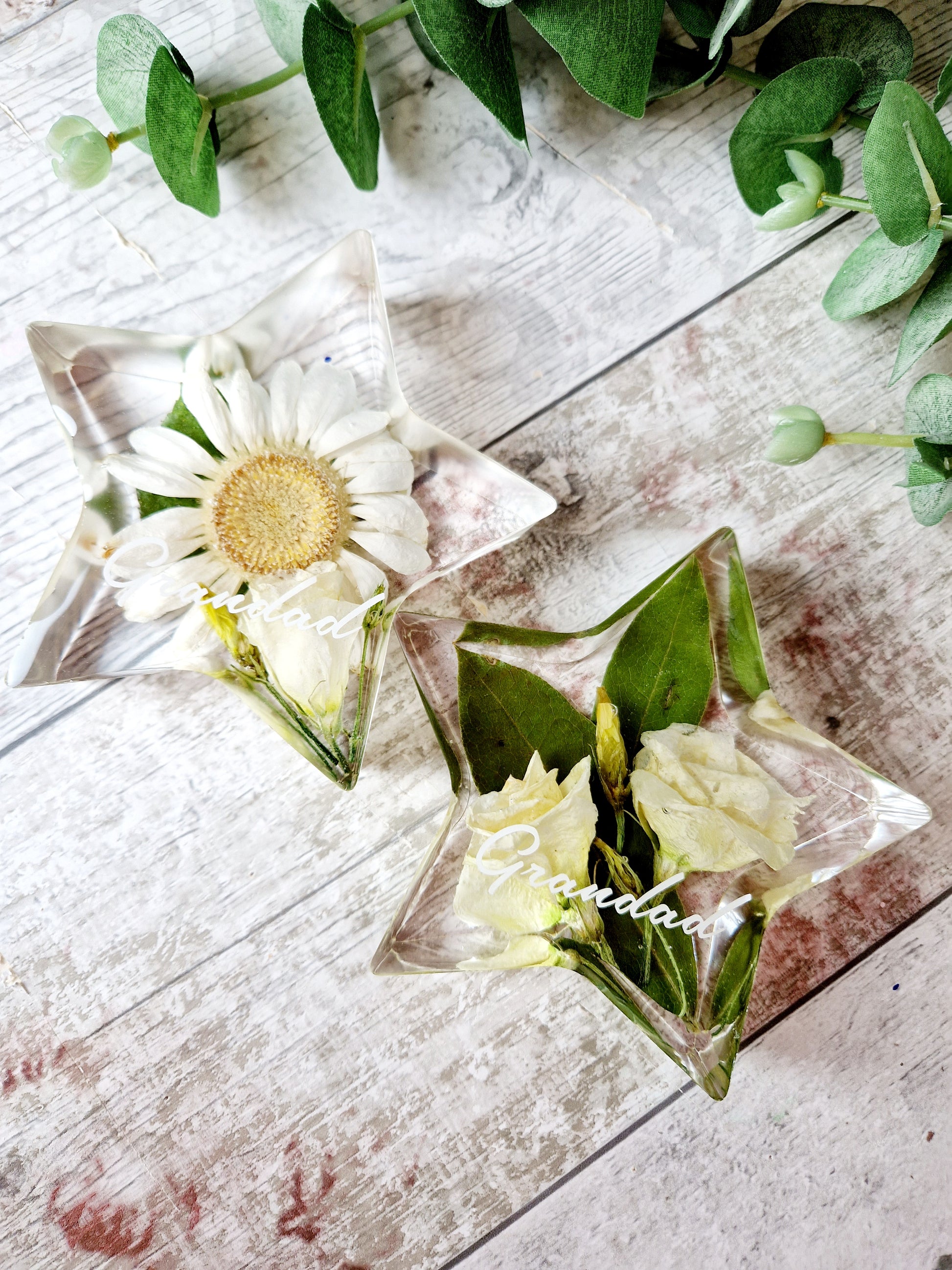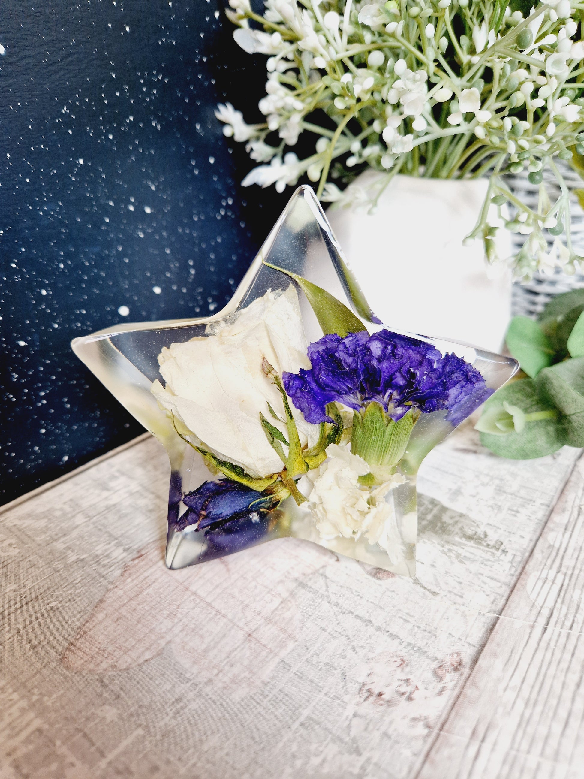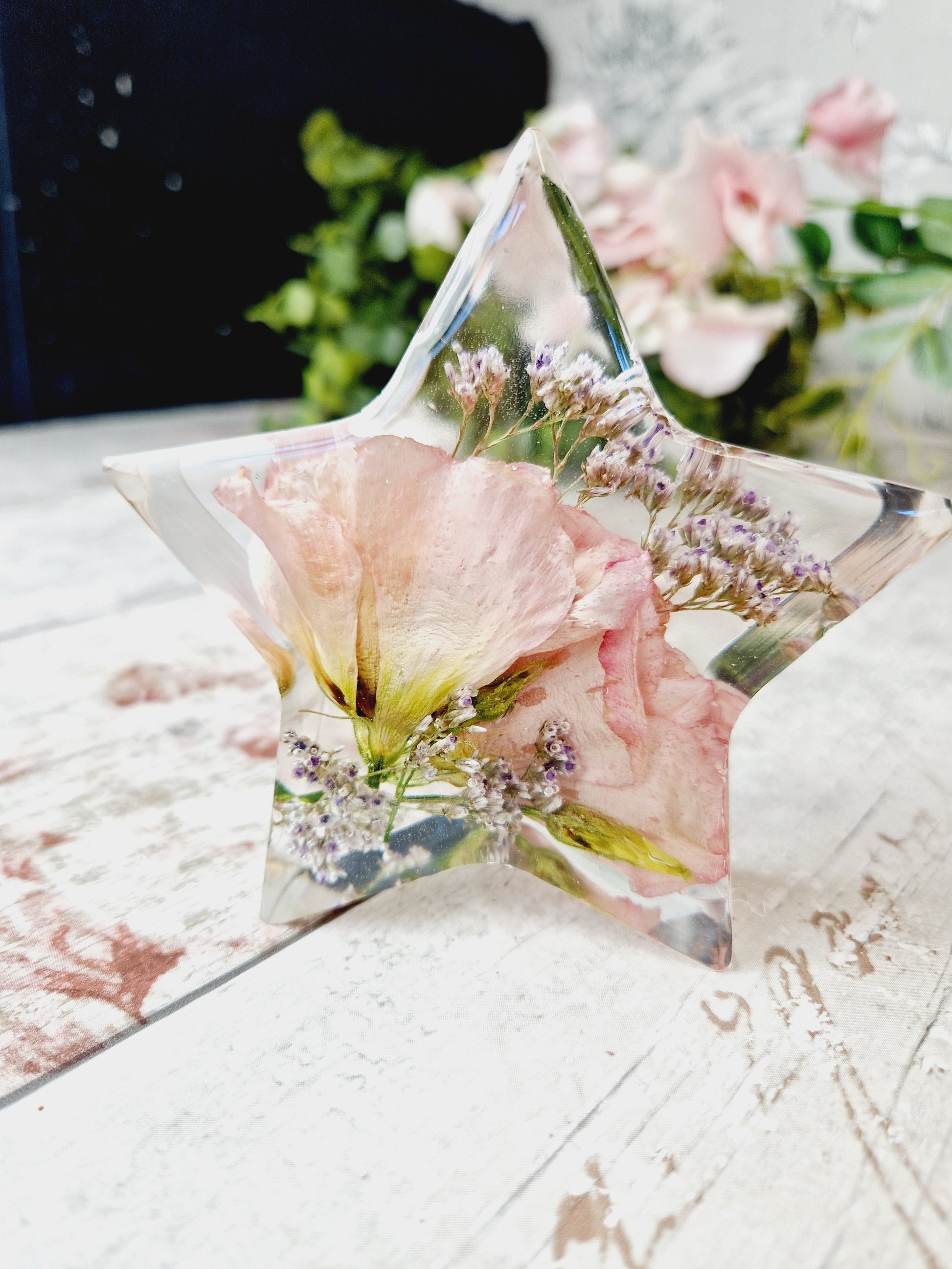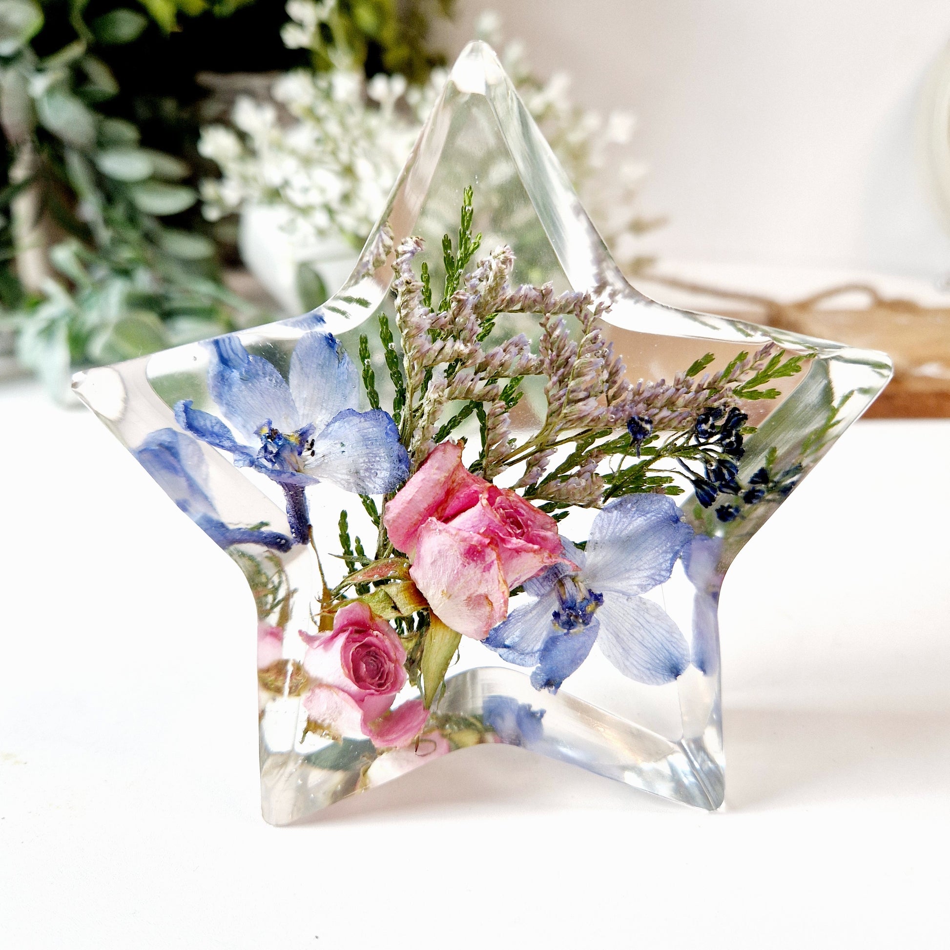 10cm x 2. 5cm resin floral star is suitable for smaller sized flowers. Makes a beautiful keepsake or gift from your special occasion.