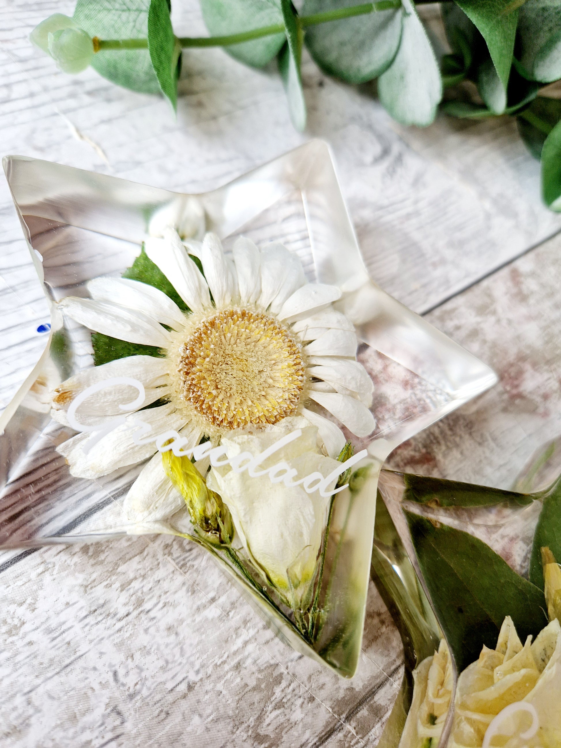 This includes the drying of your flowers so that they can be encapsulated inside the resin star 10cm by 2.5cm deep. I am also able to use your own dried flowers.