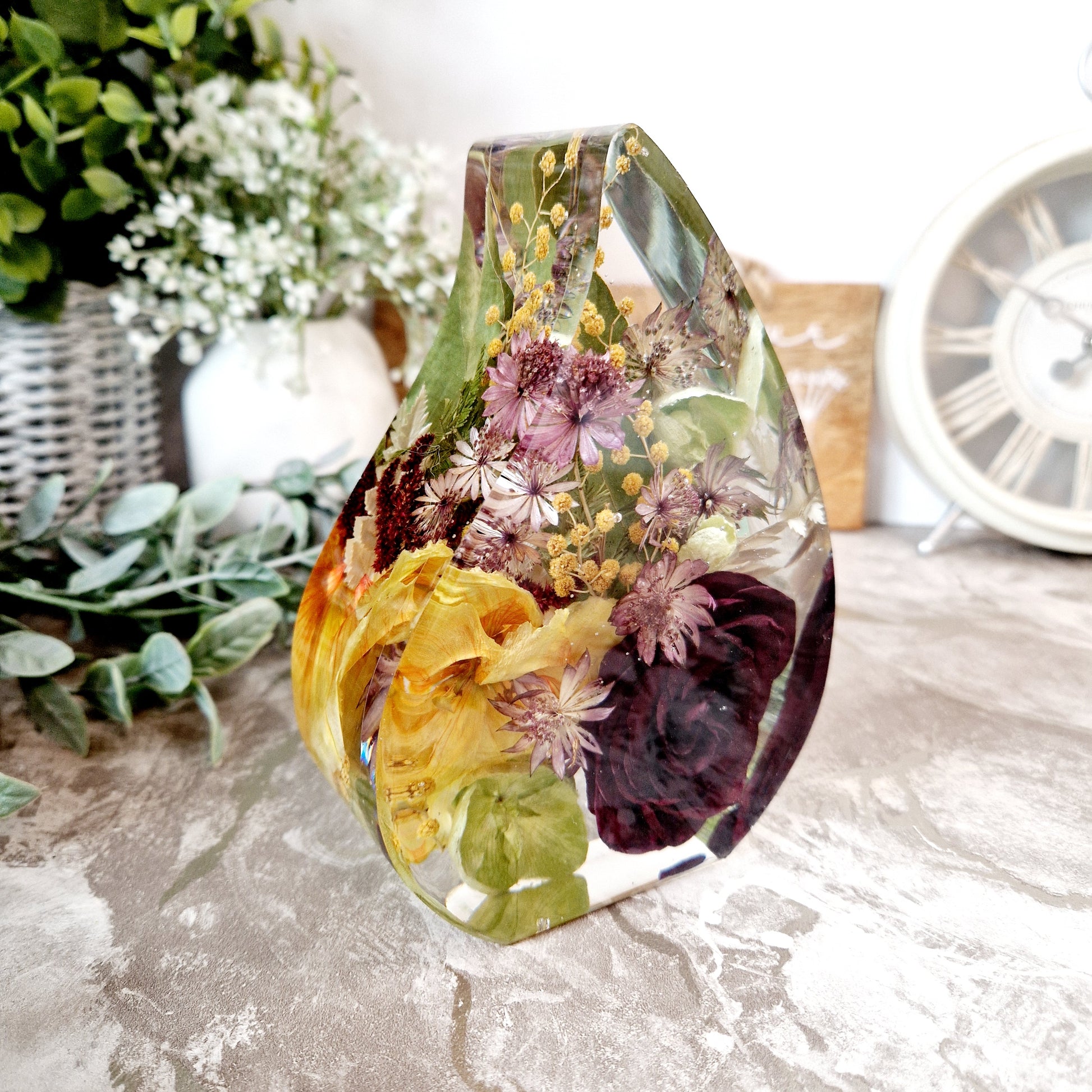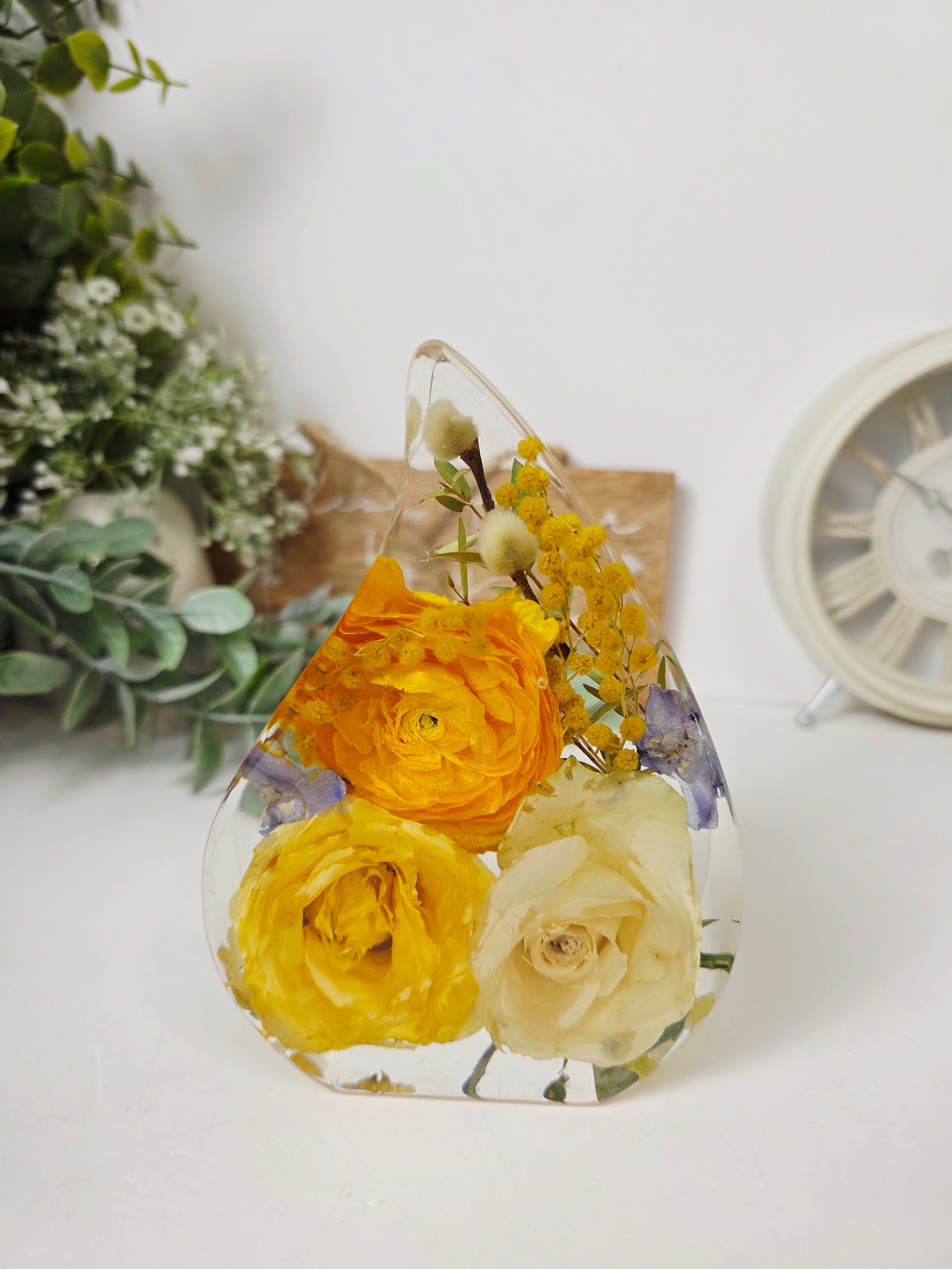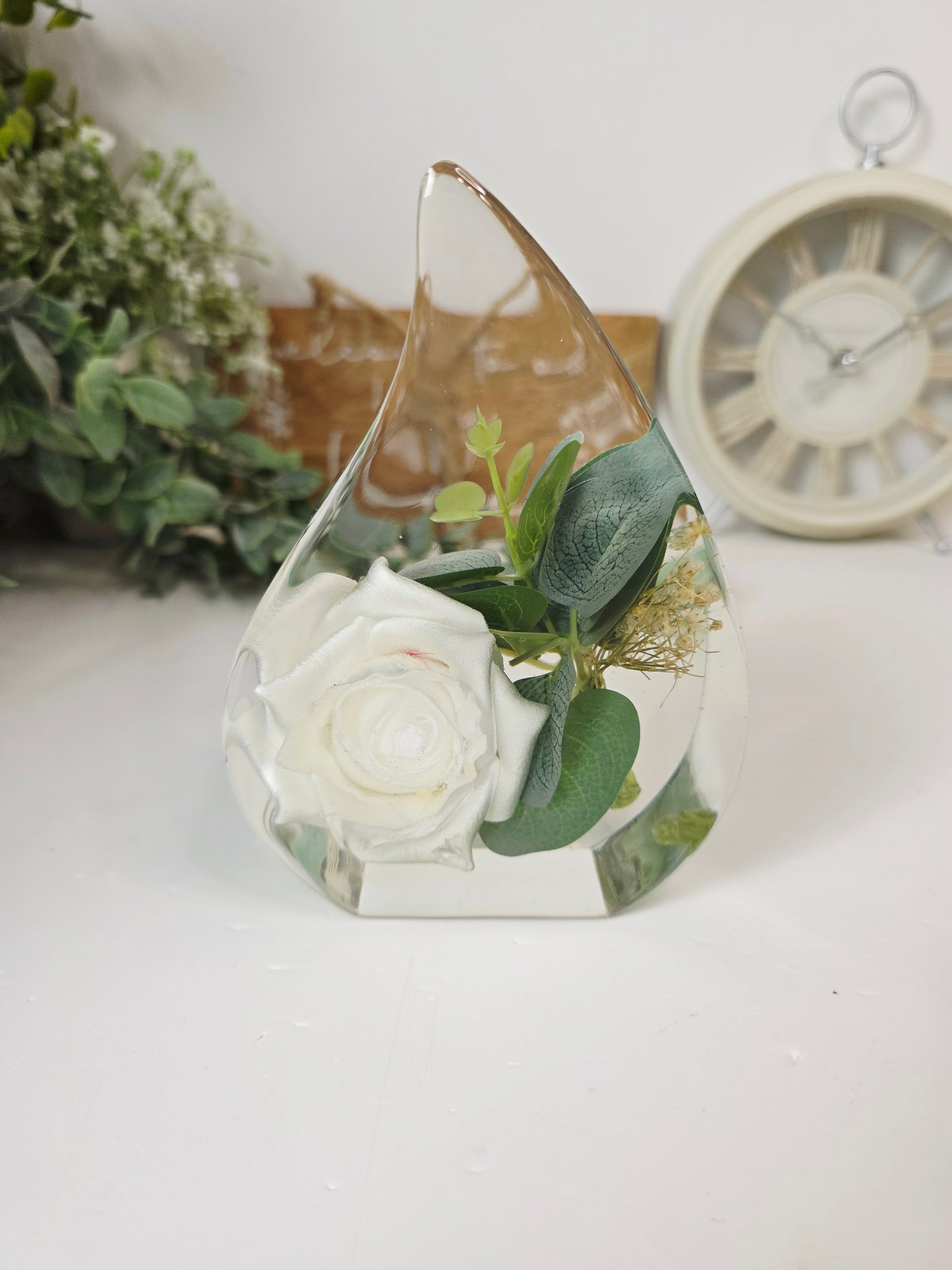 This elegant Tear Drop-shaped display, measuring 14cm tall with a 10cm width and 5cm depth, offers a refined way to showcase your precious preserved flowers. Its graceful form enhances any occasion's memories, making it a timeless piece for your home or gift collection.