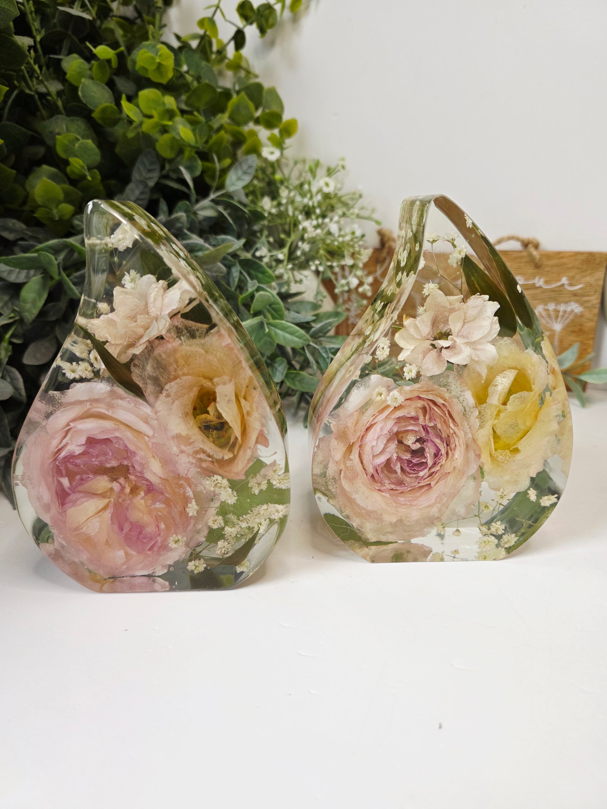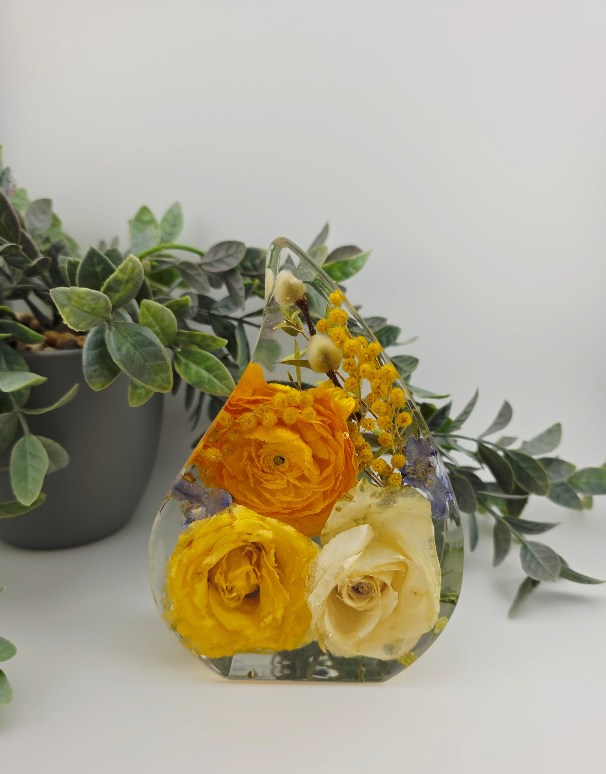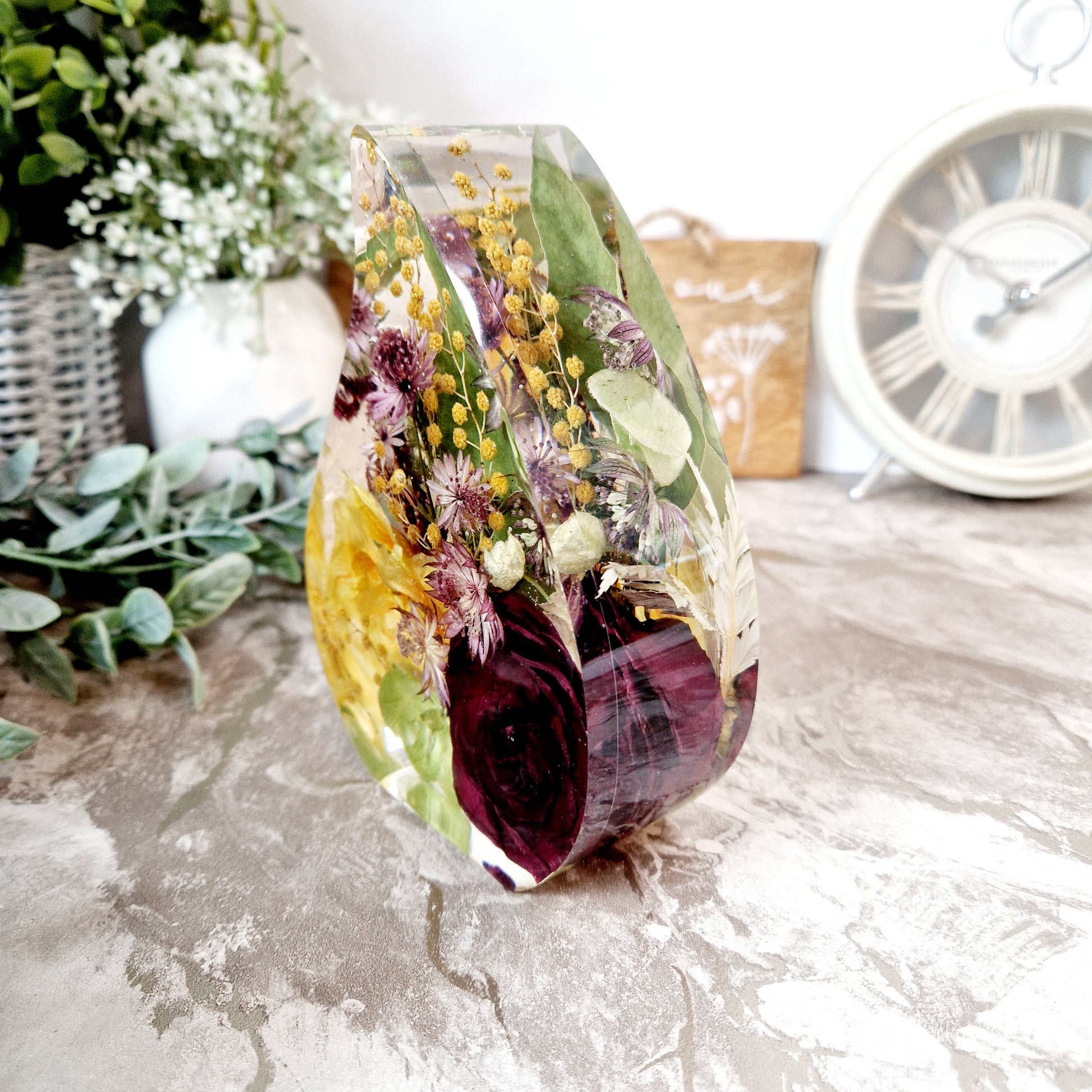 This elegant Tear Drop-shaped display, measuring 14cm tall with a 10cm width and 5cm depth, offers a refined way to showcase your precious preserved flowers. Its graceful form enhances any occasion's memories, making it a timeless piece for your home or gift collection.