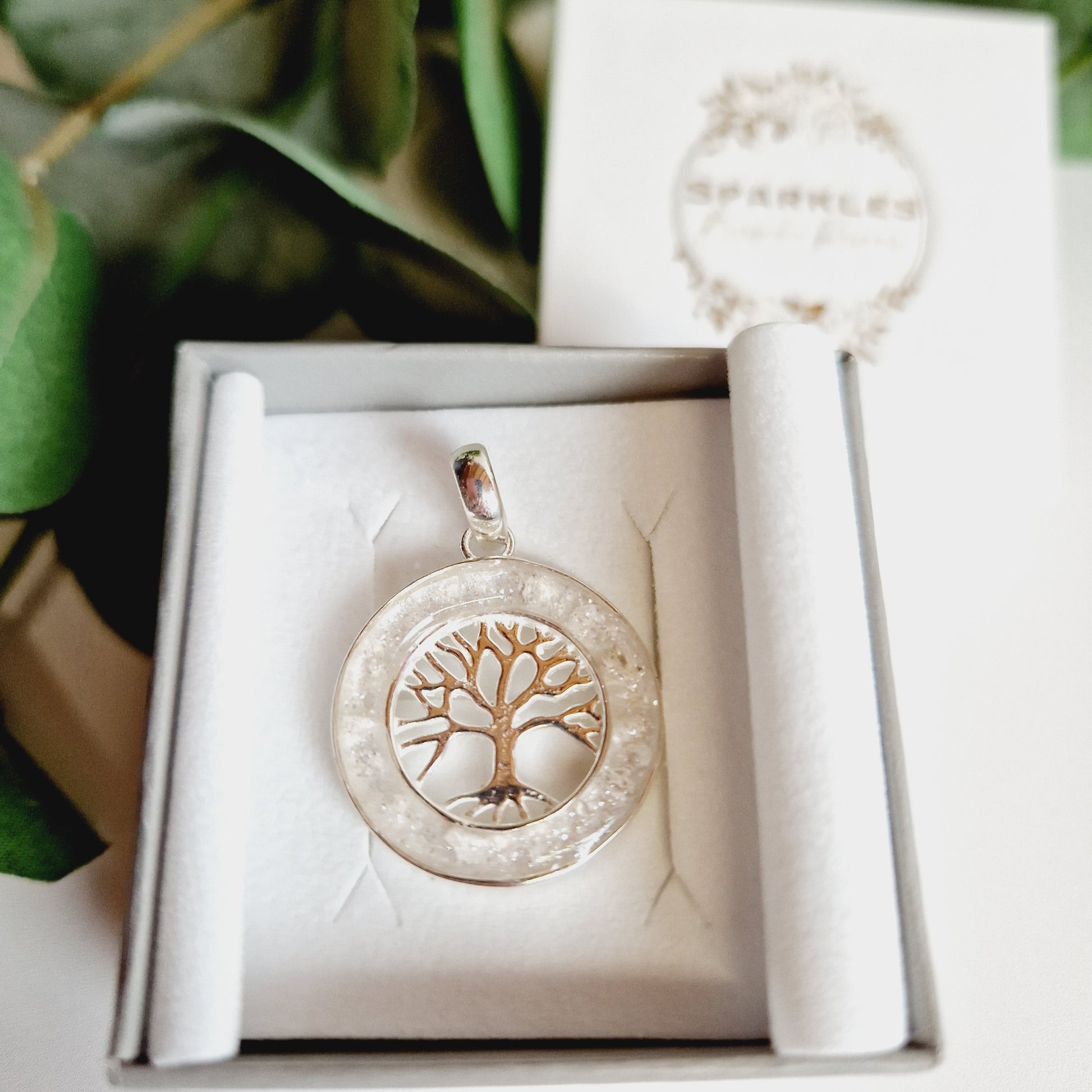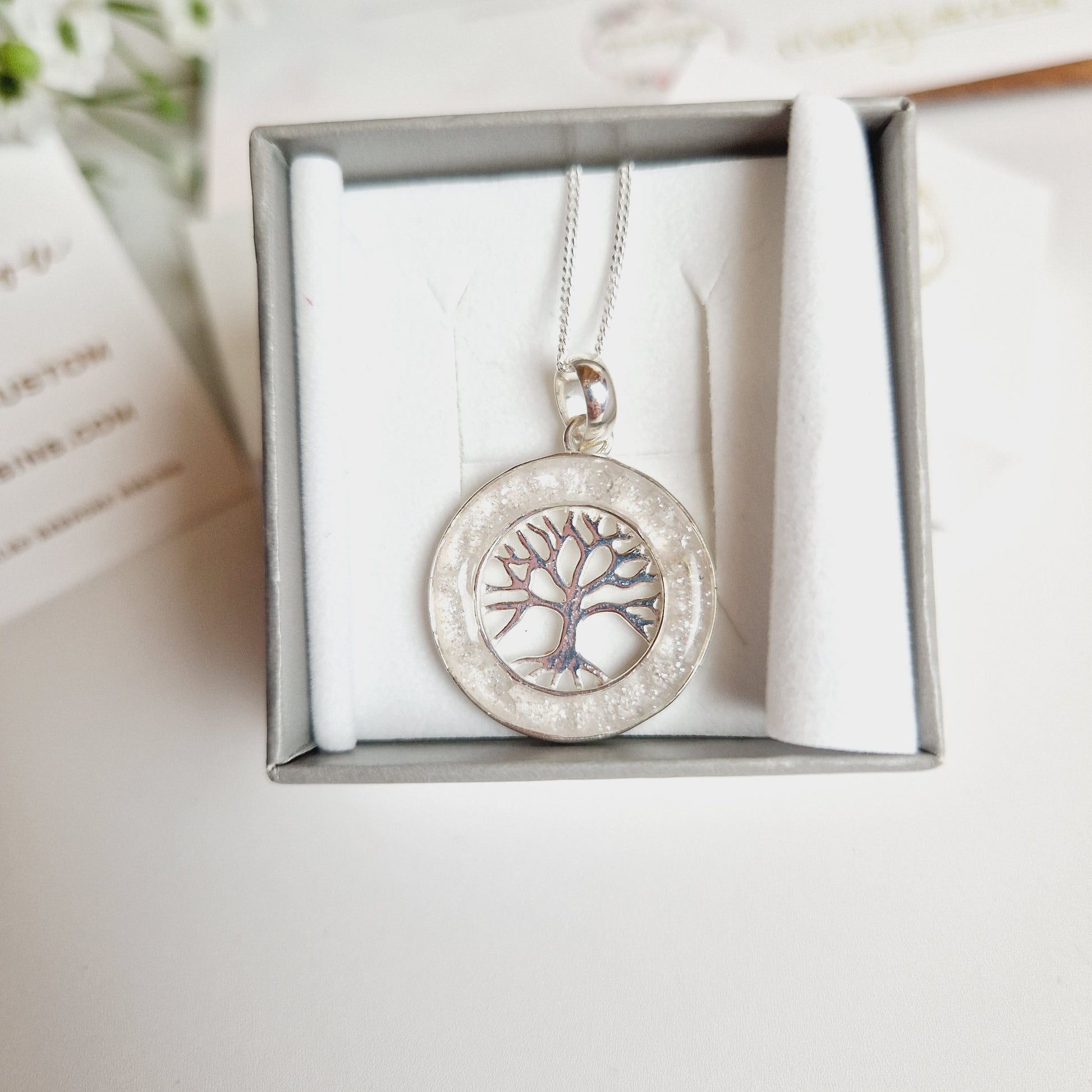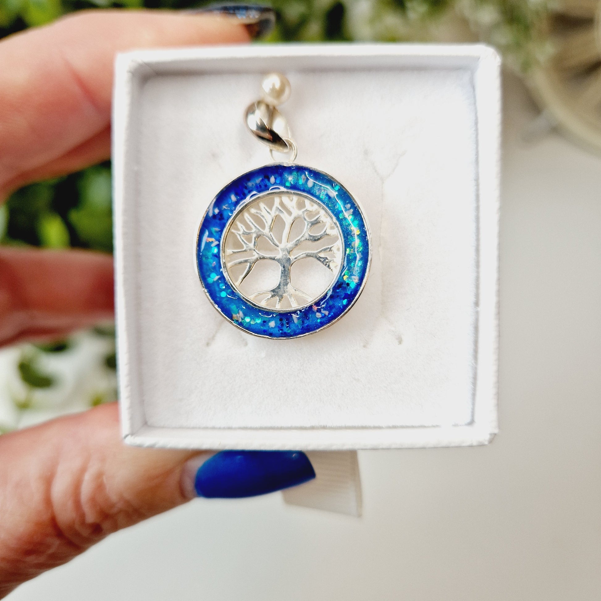 This exquisite Tree of Life pendant is exquisitely crafted in sterling silver, and can be customised to feature the ashes of a cherished loved one, or a lock of hair. A truly unique way to honour their memory, this bespoke pendant is available in a variety of colours to suit every style.