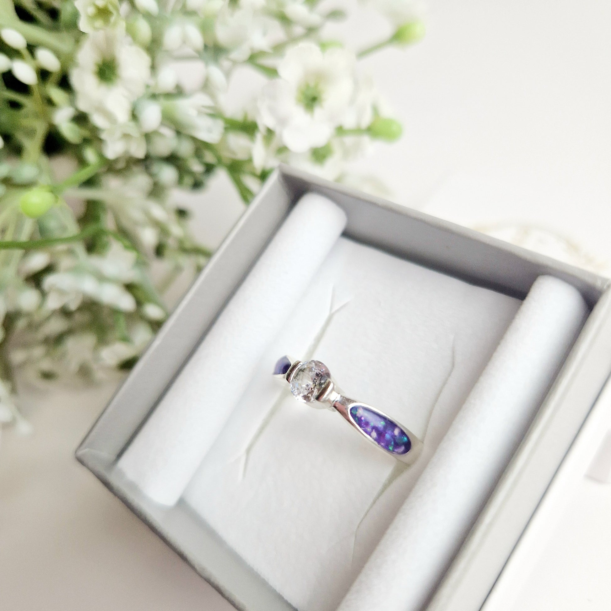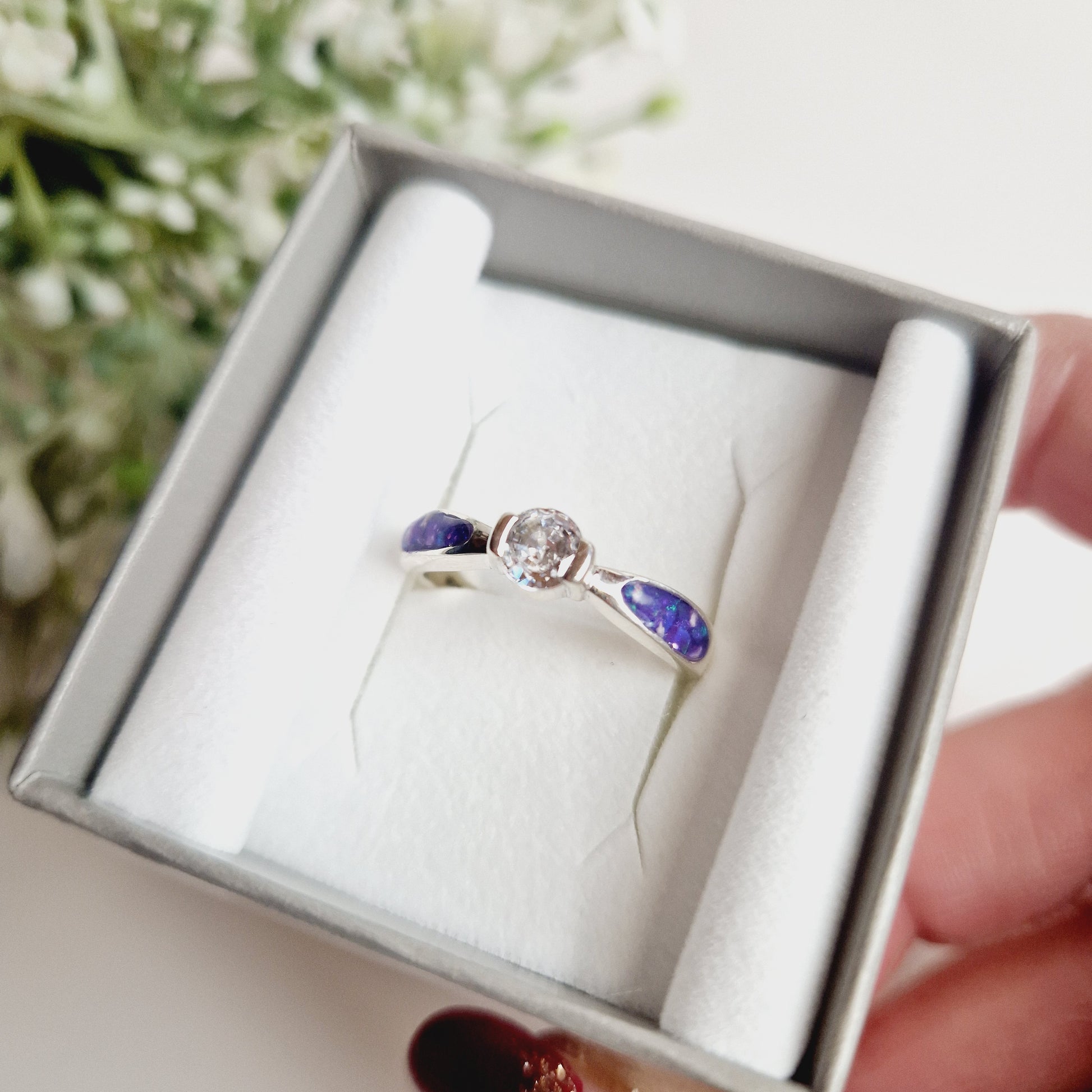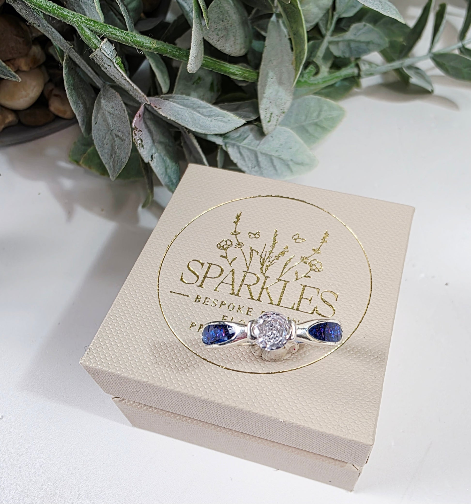 This exquisite solitaire ring for ladies exudes classic elegance. Crafted in sterling silver, the ring features a single, dazzling crystal set in its center, surrounded by grooves where your special ash inclusion can be placed. Its simple yet luxurious design makes it the perfect accessory for any occasion.