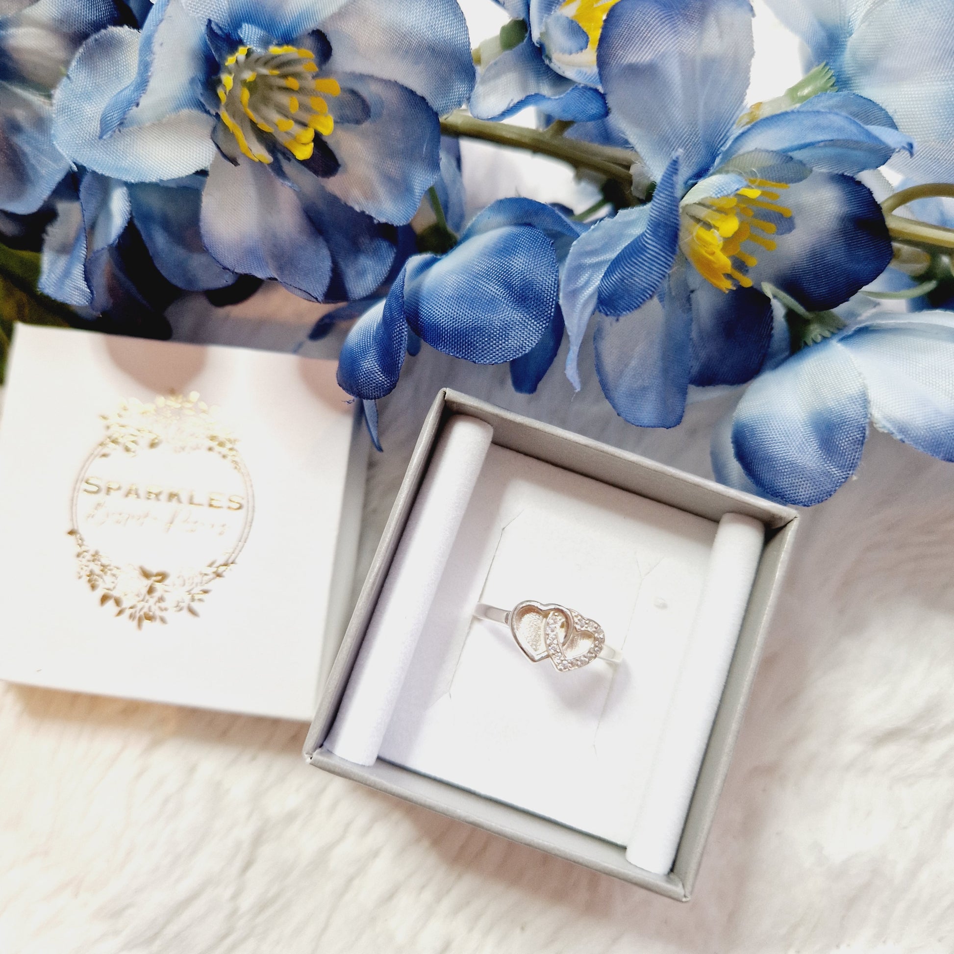 This exquisite entwined heart ring is expertly fashioned with sterling silver and sparkling crystals. Delicately crafted, the two hearts symbolize everlasting love, beautifully enhanced with an ash inclusion to further honor those closest to your heart. An elegant and tasteful piece of jewelry sure to be cherished.